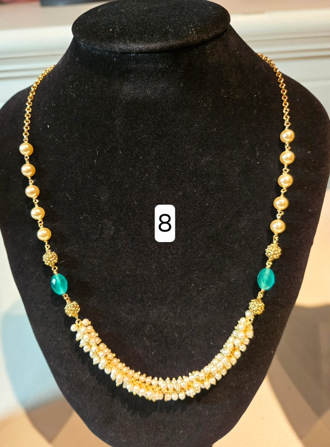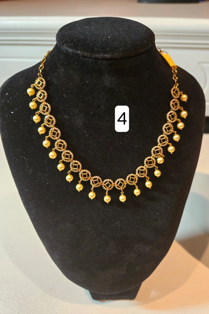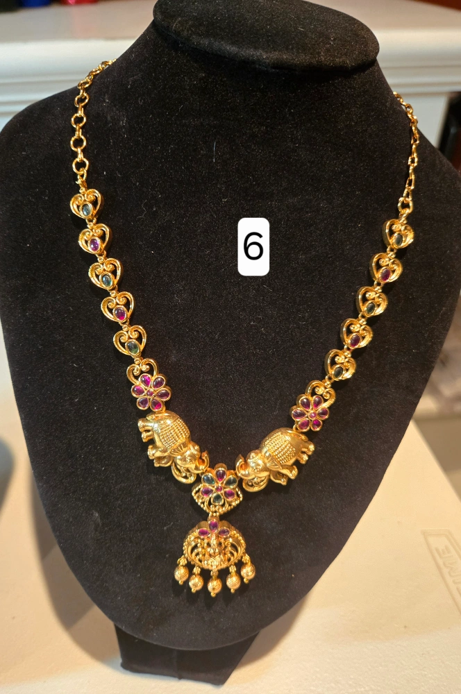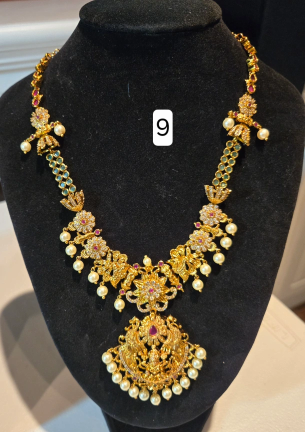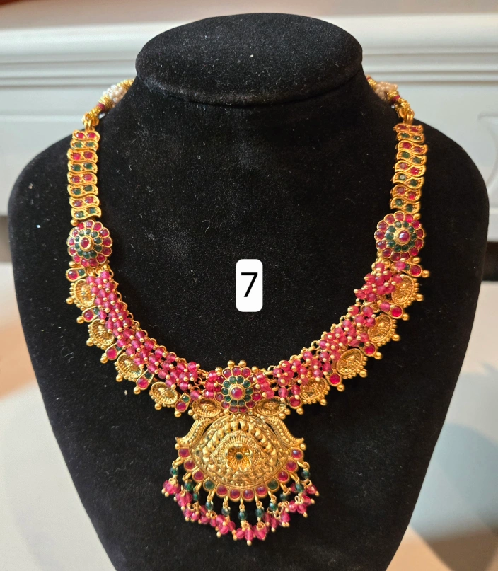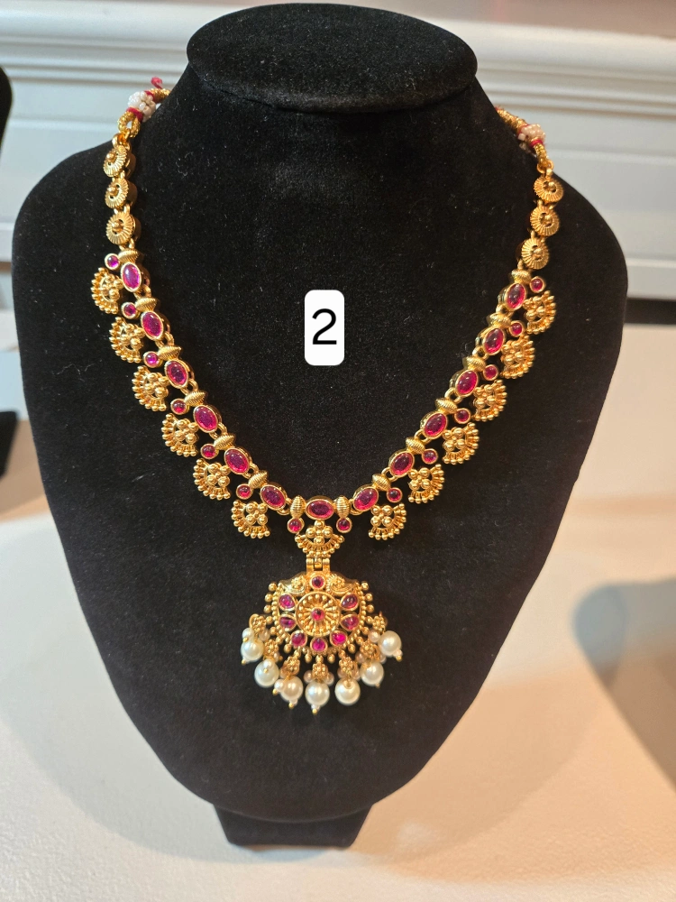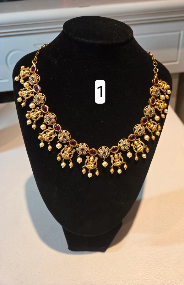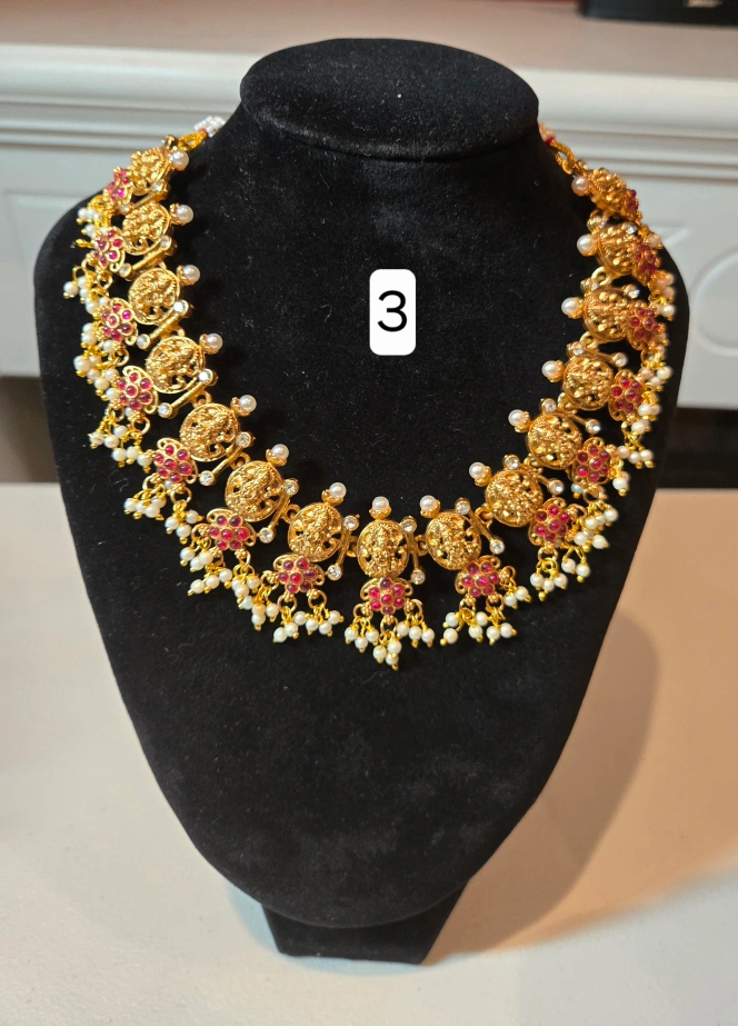 Selling a beautiful gold-tone necklace with an Indian-inspired design. It features intricate detailing and a lovely combination of gold, red, and pearl accents. These are brand new and ready to add a touch of elegance to any outfit