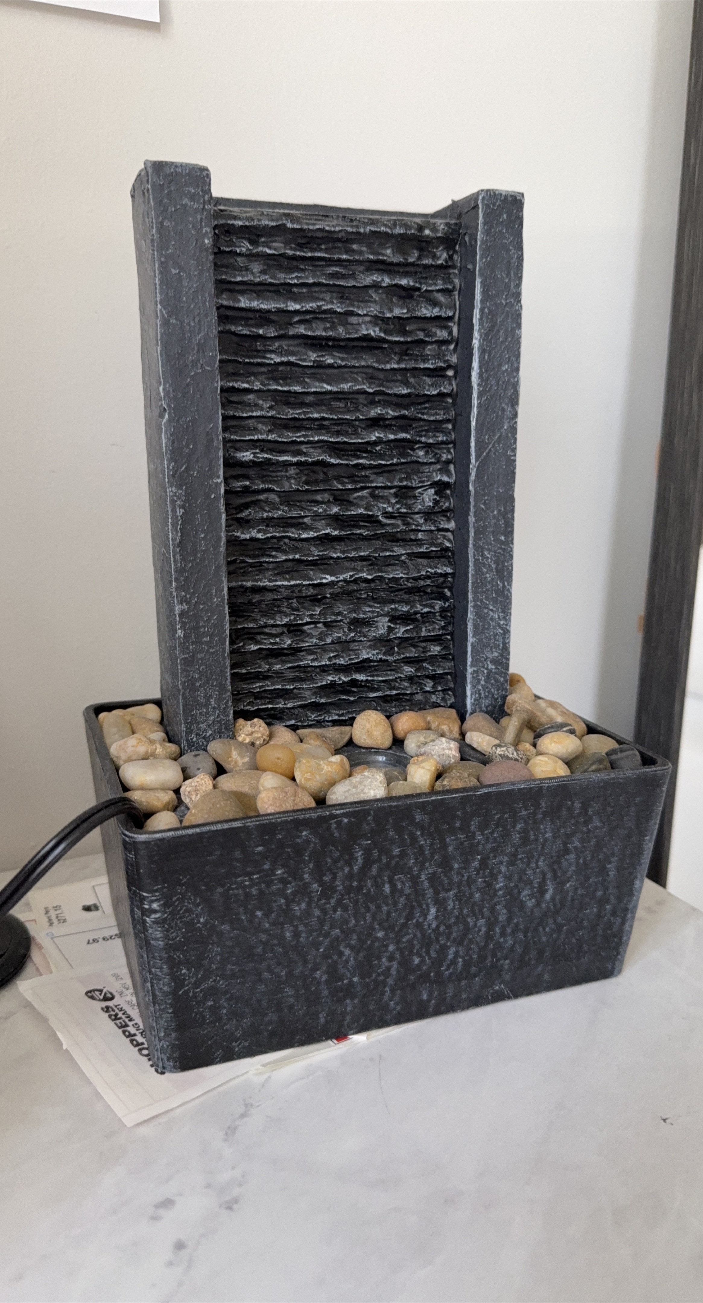 Indoor water fountain with a modern, tiered design and decorative rocks. It's a great way to add a calming and peaceful ambiance to your home or office space