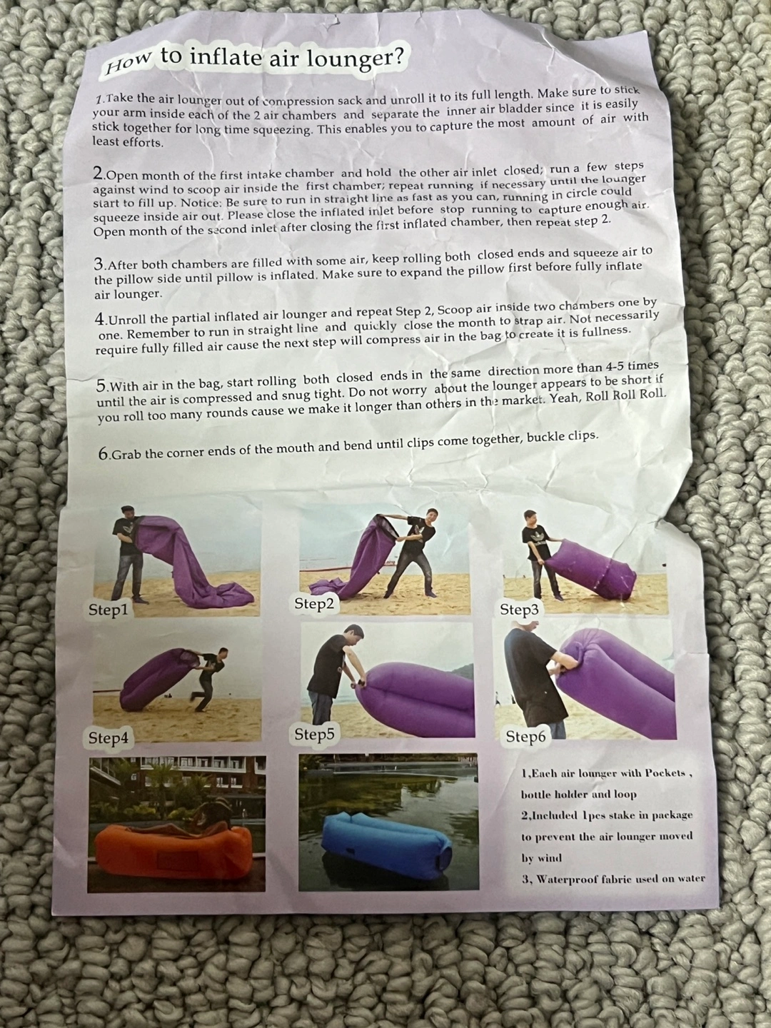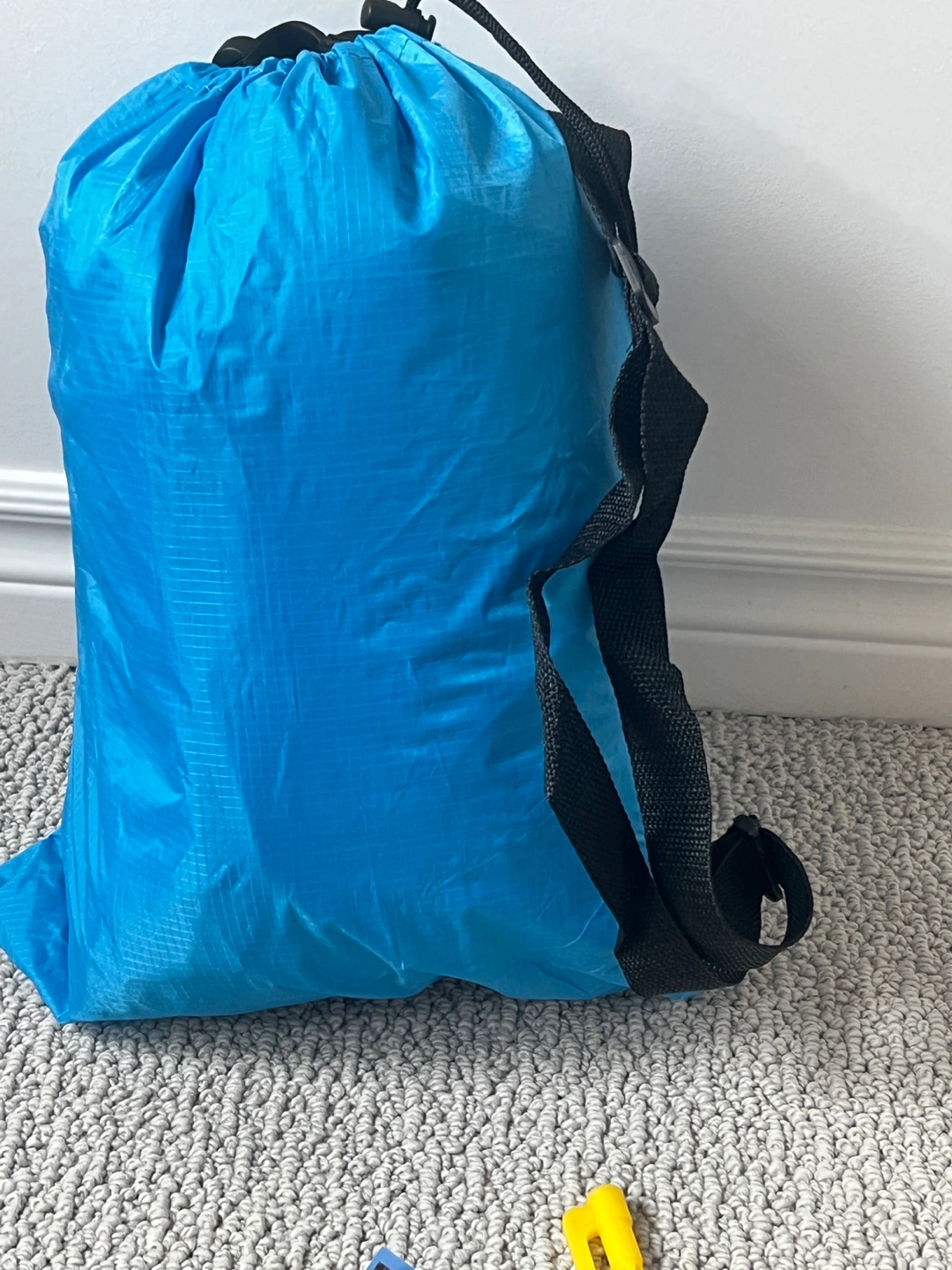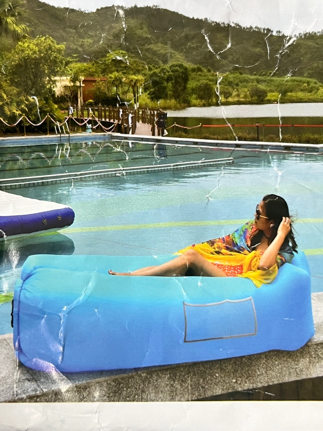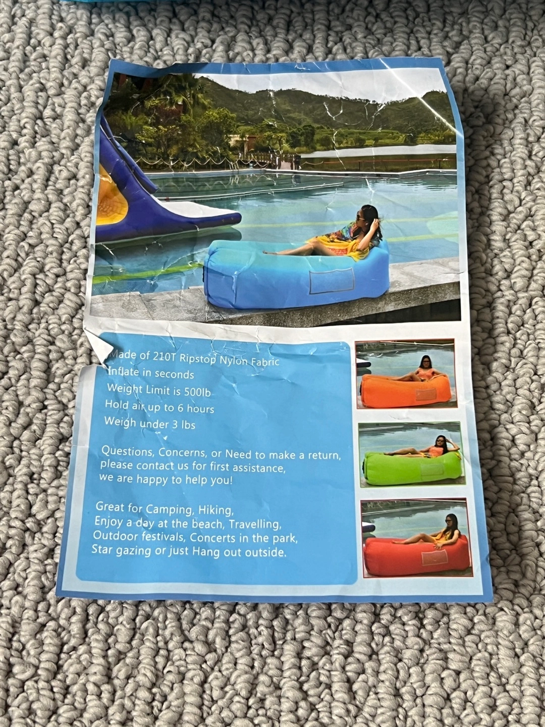 Lightweight inflatable lounger. Great for relaxing by the pool or at the beach. Packs into a small carrying bag with shoulder strap. Inflates quickly. Durable ripstop nylon fabric. Weight limit 500 lbs. Brand new never used still in box