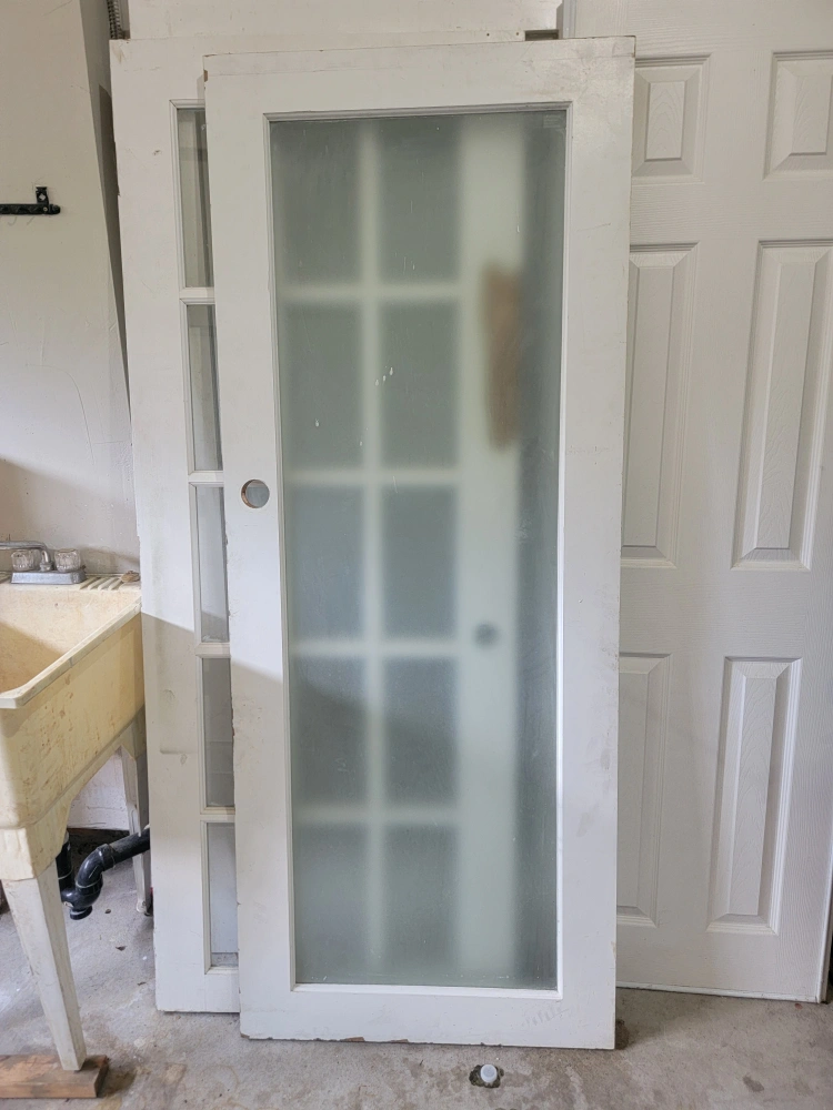 Selling an interior door with frosted glass. It measures approximately 75 inches in height and 32 inches in width. Perfect for adding privacy while still letting in light!