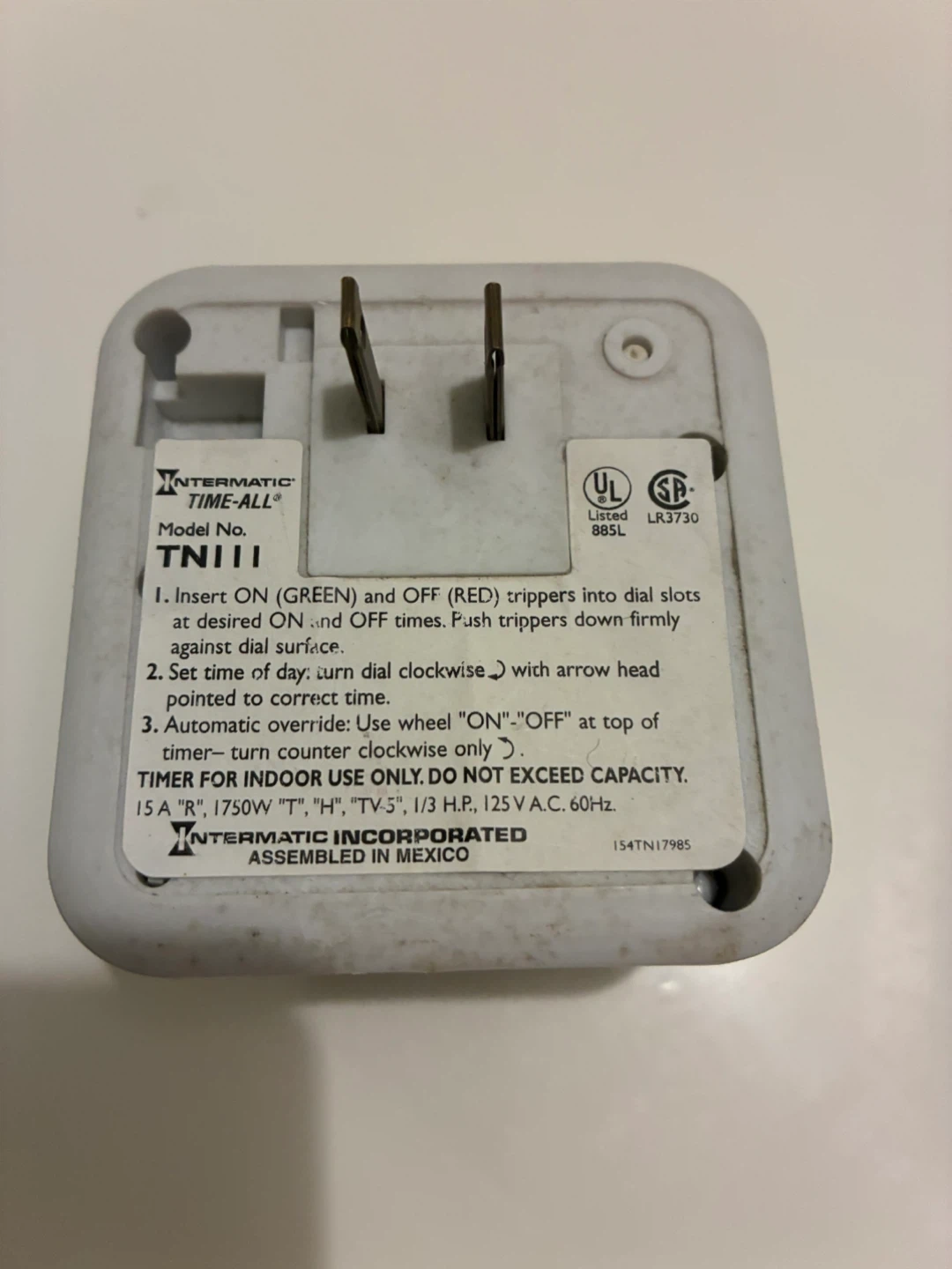 Selling an Intermatic Time-All timer, model TN111. It's great for indoor use and can handle up to 15A, 1750W. It allows you to set timers for different times of the day
