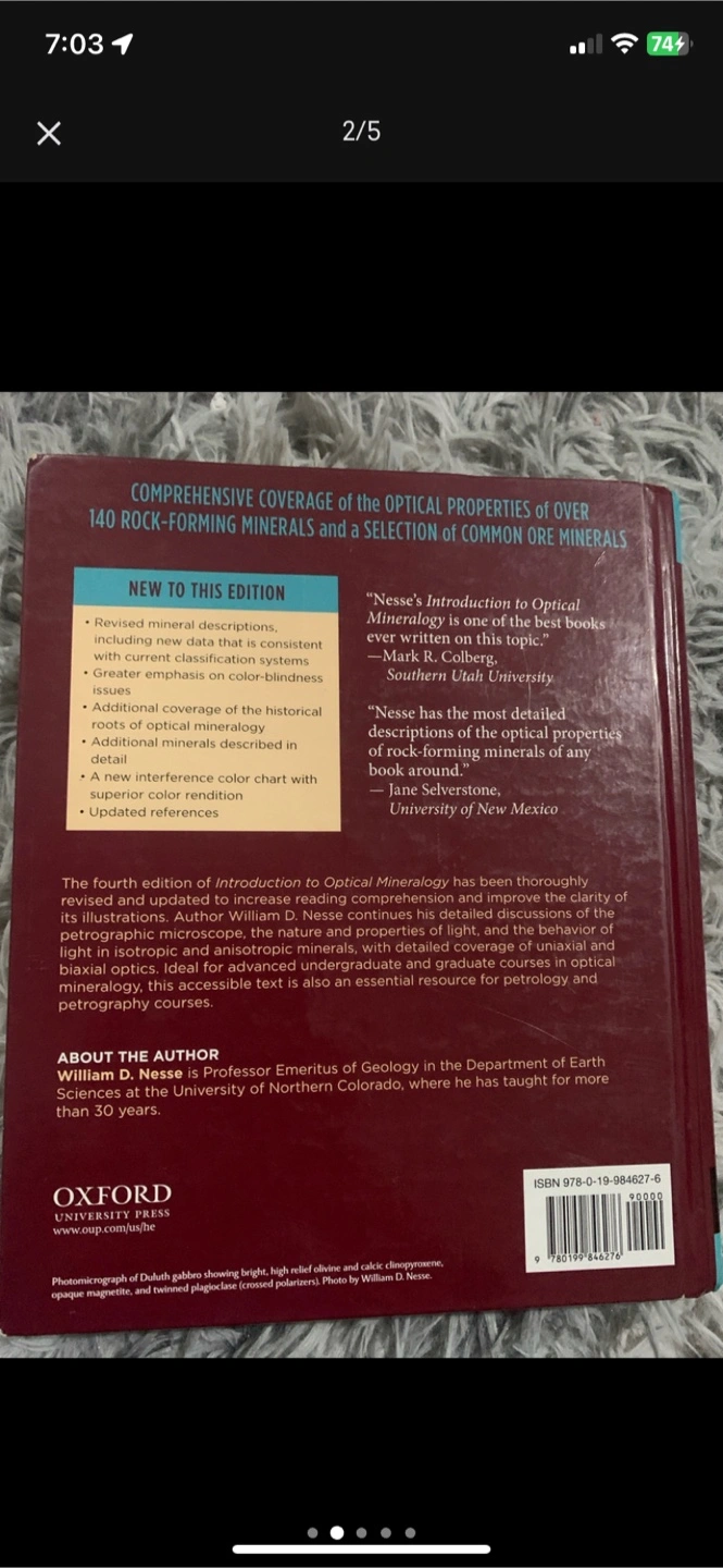 Selling a used copy of "Introduction to Optical Mineralogy, Fourth Edition" by William D. Nesse, published by Oxford University Press. This textbook is a great resource for anyone studying optical mineralogy and petrography courses. It offers comprehensive coverage of rock-forming minerals.