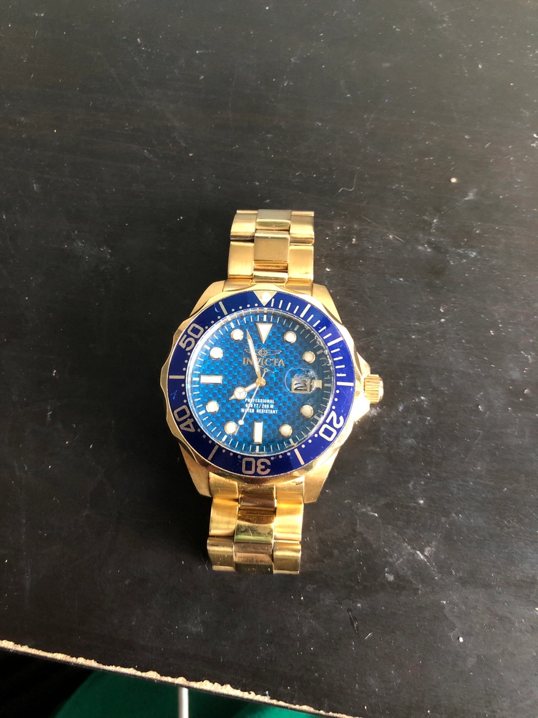 Selling a gold Invicta Pro Diver watch with a striking blue face and bezel! It's in great shape and ready for a new wrist