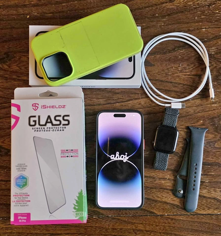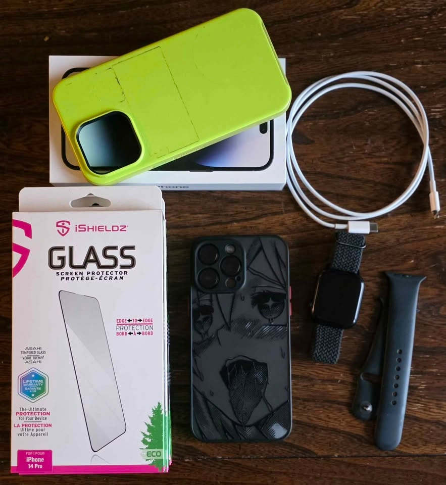 OPEN TO NEGOTIATING iPhone 14 pro max 128gb w/original box. Phone has been in a case & using a screen protector since opening box. No scratches. 2 cases (green & anime), 1 replacement screen protector, several charging cords. Watch series 7, extra watch band. 2 additional iPhone 14 pro screen protectors. CASH ONLY