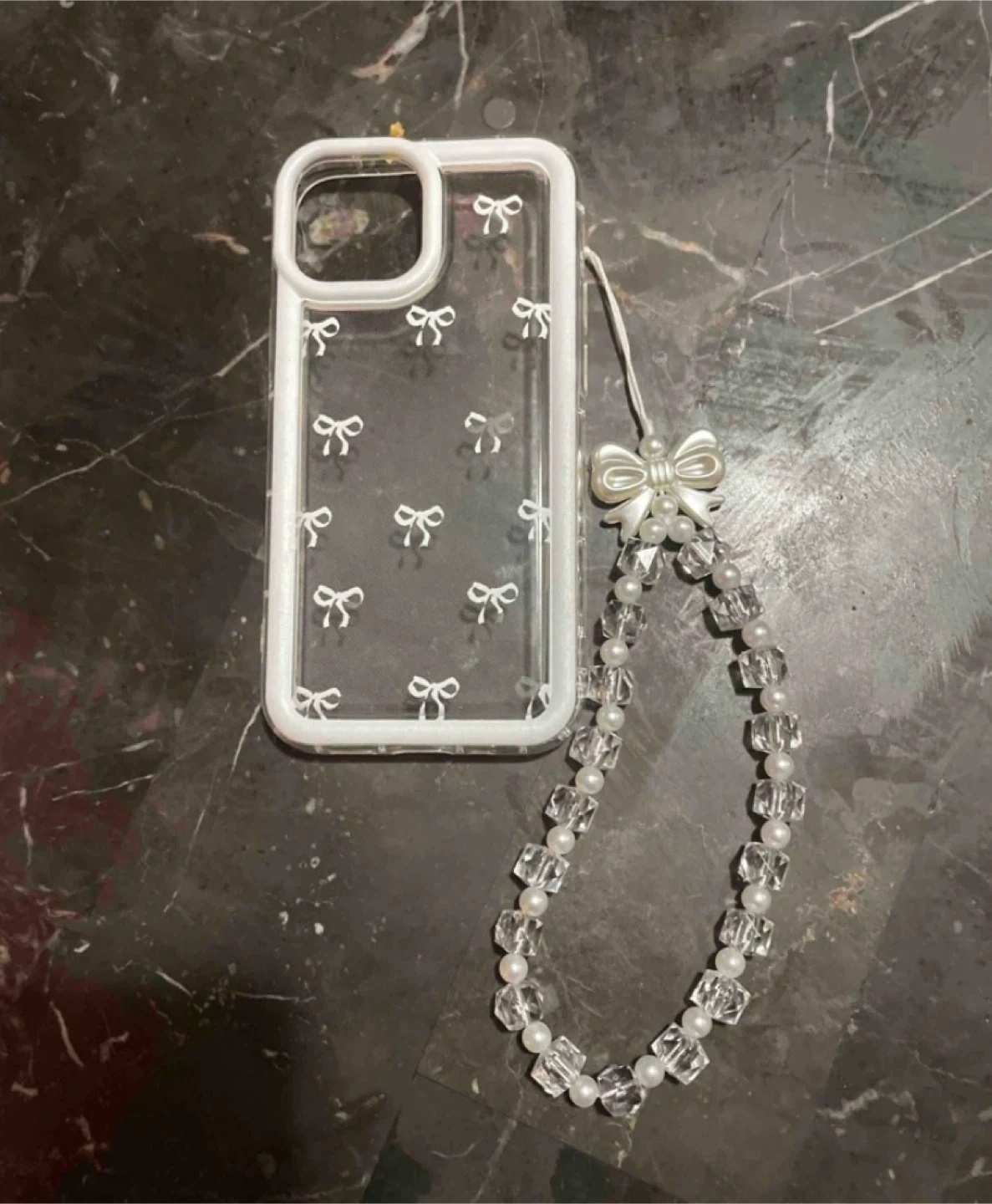Cute iPhone case with a bow design and a pearl strap! It's in great condition and ready for a new home. The clear case has little white bows printed on it, and the strap is made of clear and pearl-like beads. Adds a touch of elegance to your phone