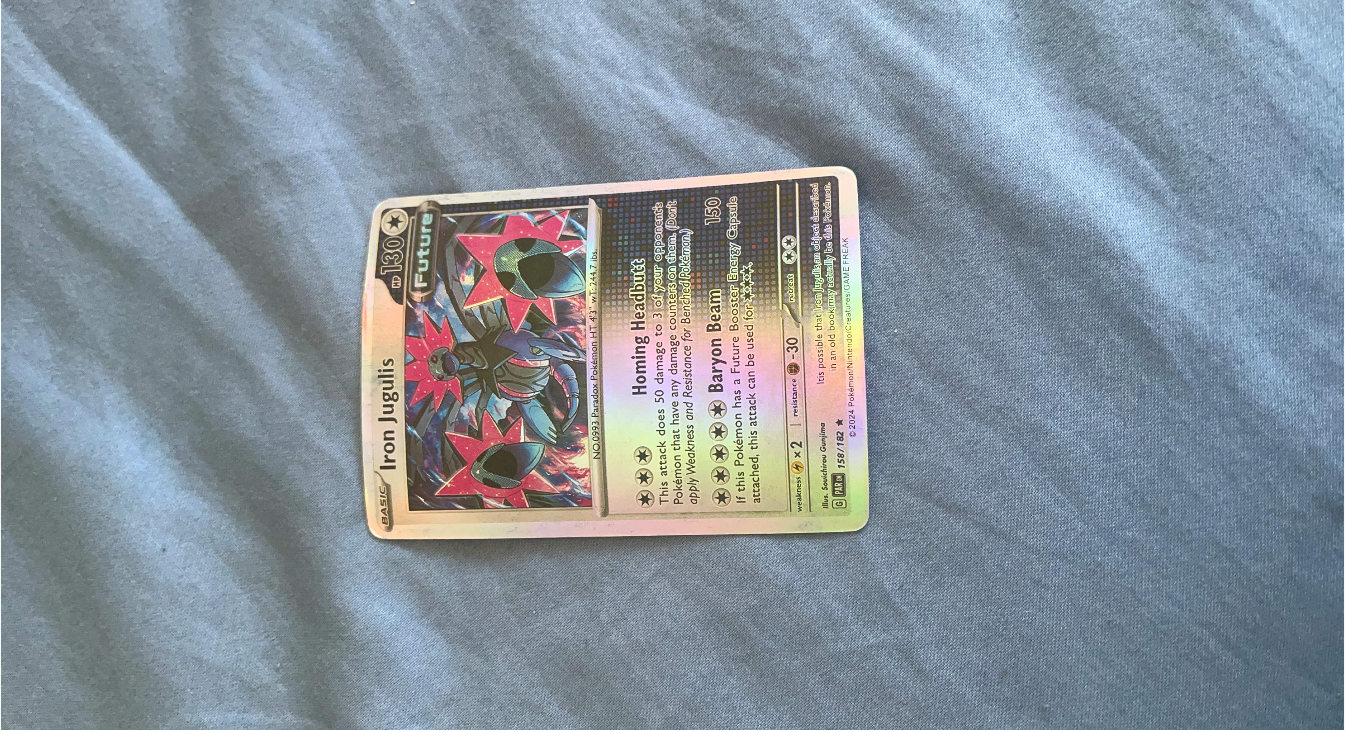 Selling an Iron Jugulis Pokemon card! It's a basic card with 130 HP and the Future attribute. The card features the Homing Headbutt and Baryon Beam attacks. The card is illustrated by Souichirou Gunjima.