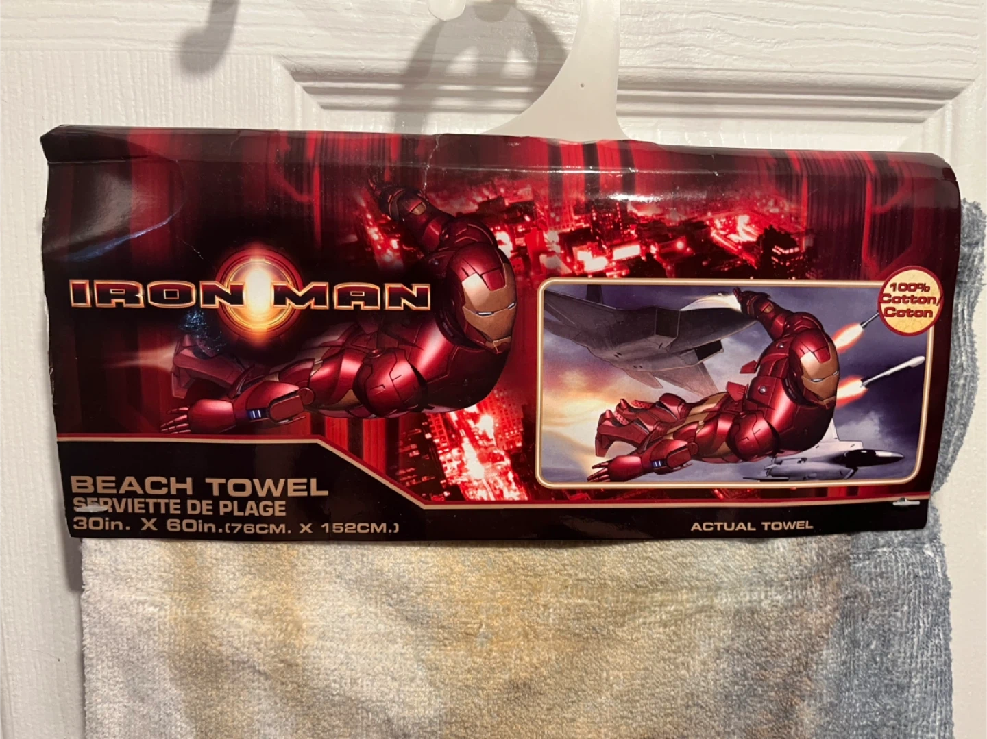 Iron Man beach towel, brand new in packaging! The towel is 30 inches by 60 inches (76cm x 152cm) and made of 100% cotton