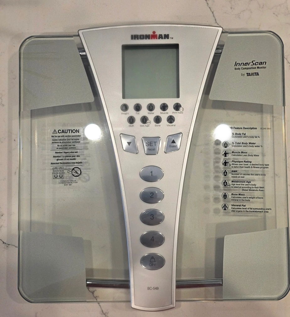 Get detailed body composition readings with this Ironman InnerScan monitor by Tanita! It measures weight, body fat %, total body water %, muscle mass, physique rating, BMR, metabolism age, bone mass, and visceral fat levels. Perfect for tracking your fitness progress. Was given to me. I don't need all this info and can't figure it out anyway lol. 50 obo