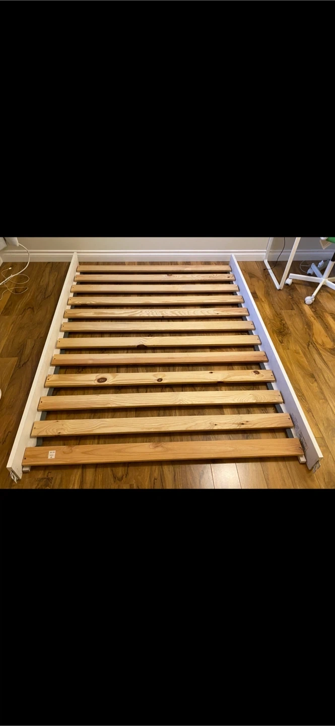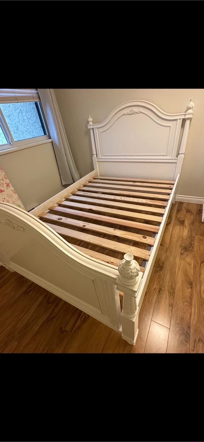 This white hardwood bed frame is for a full/double size mattress and is perfect for a child's room or a guest room, offering a touch of elegance with its decorative details. The Young America Isabella Collection by Stanley Furniture Company bed features graceful curves on both the headboard and high footboard, with romantic carved posts, paneled molding, and a carved rose motif for a feminine touch. Constructed of poplar, hardwood solids, and select poplar veneers, it includes carved finials on the headboard and footboard. A slat roll mattress support removes the need for a box spring or bunkie board, while the hi-lock position allows for under-bed storage with a Full (Double) size mattress. Specifications: * Size: double bed * Colour: White * Style: Cottagecore * Material: hardwood * Dimensions: 55 1/2” H * 56 1/2” W * 82” D(L) If the ad is up, the bed is available—no need to ask, just envision it in your home!