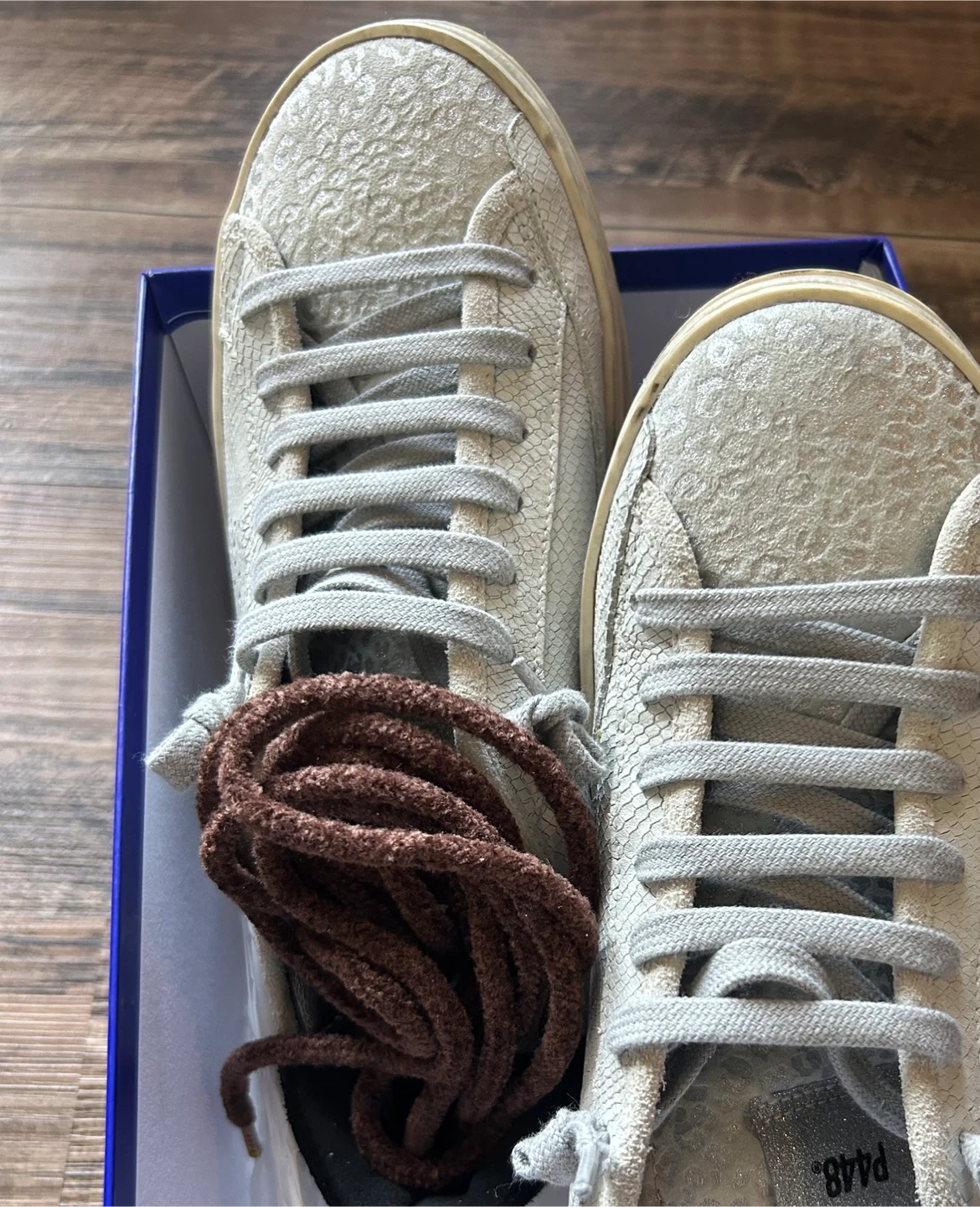 Women's P448 John sneakers. Grey leopard print. Low-top style. Lace-up closure. White rubber sole. Those marks are not dirt, they are intentional by design to make the shoes look Rugged. Extra brown laces included. Made in Italy.