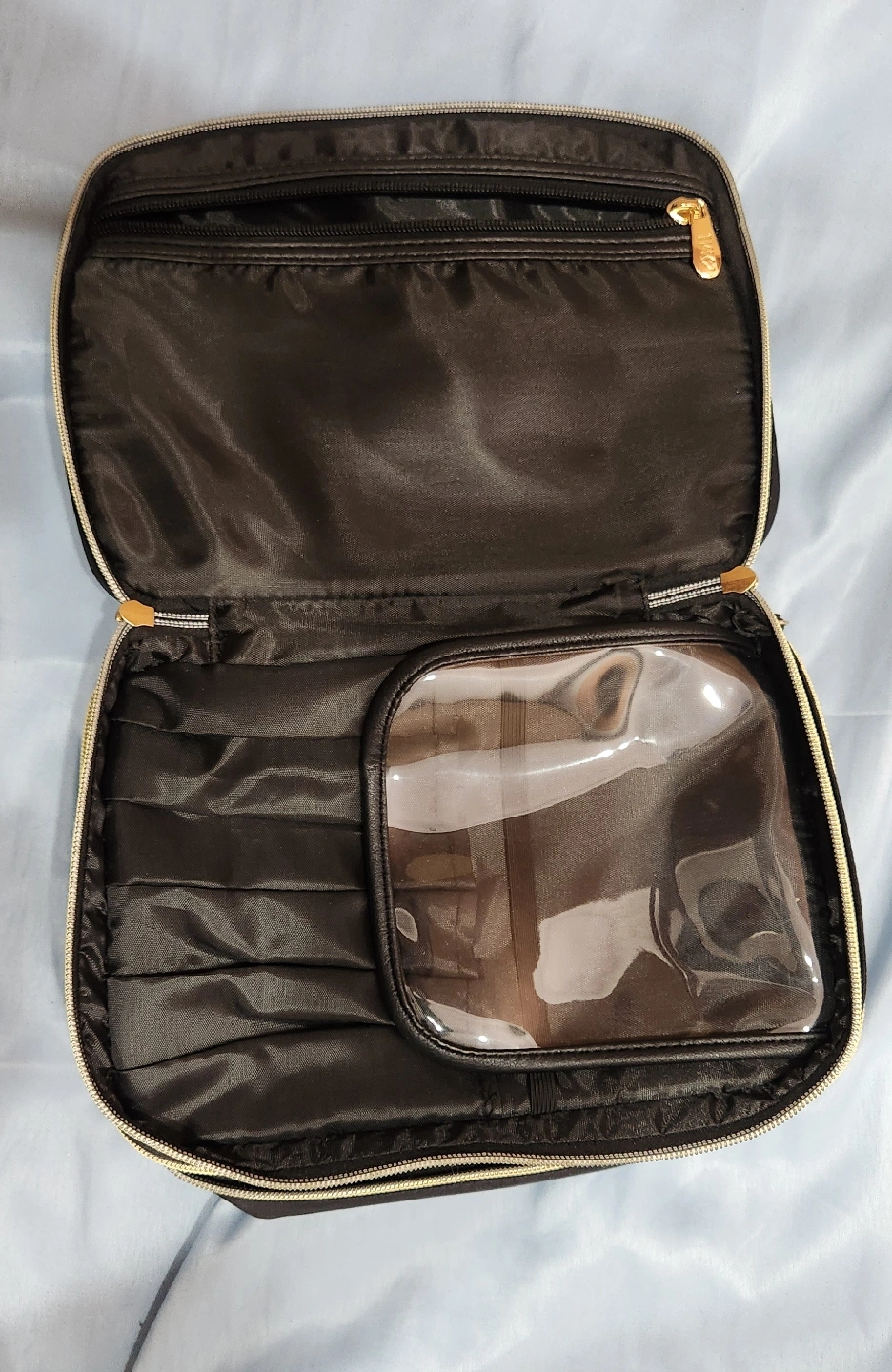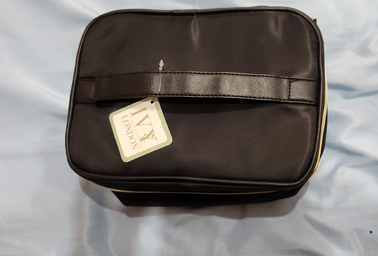 Selling a black cosmetic bag from IVY London. It's in great condition and has lots of space for all your makeup and toiletries. Perfect for travel or keeping your things organized at home! It has interior compartments and a clear pocket.