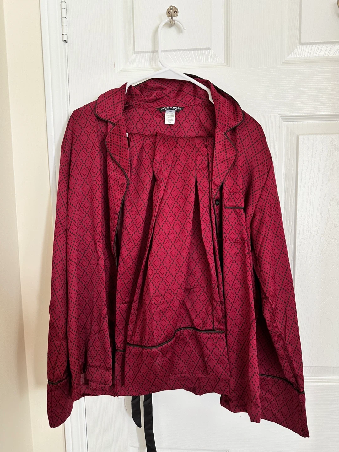 Cozy pajama set in a size M. I got these for Christmas and wore them once. They’re very comfortable, I just don’t like sleeping in pants and a long sleeve 🙂
