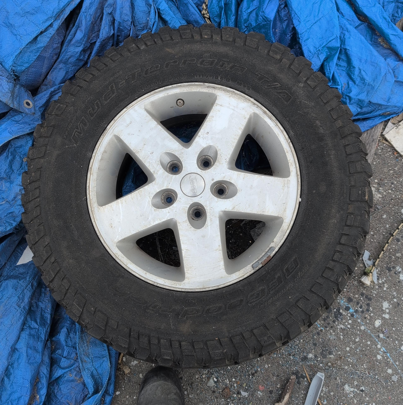 Selling a Jeep wheel with a BFGoodrich Mud-Terrain T/A tire. It shows some signs of use, but is still in good shape for off-roading or as a spare.
