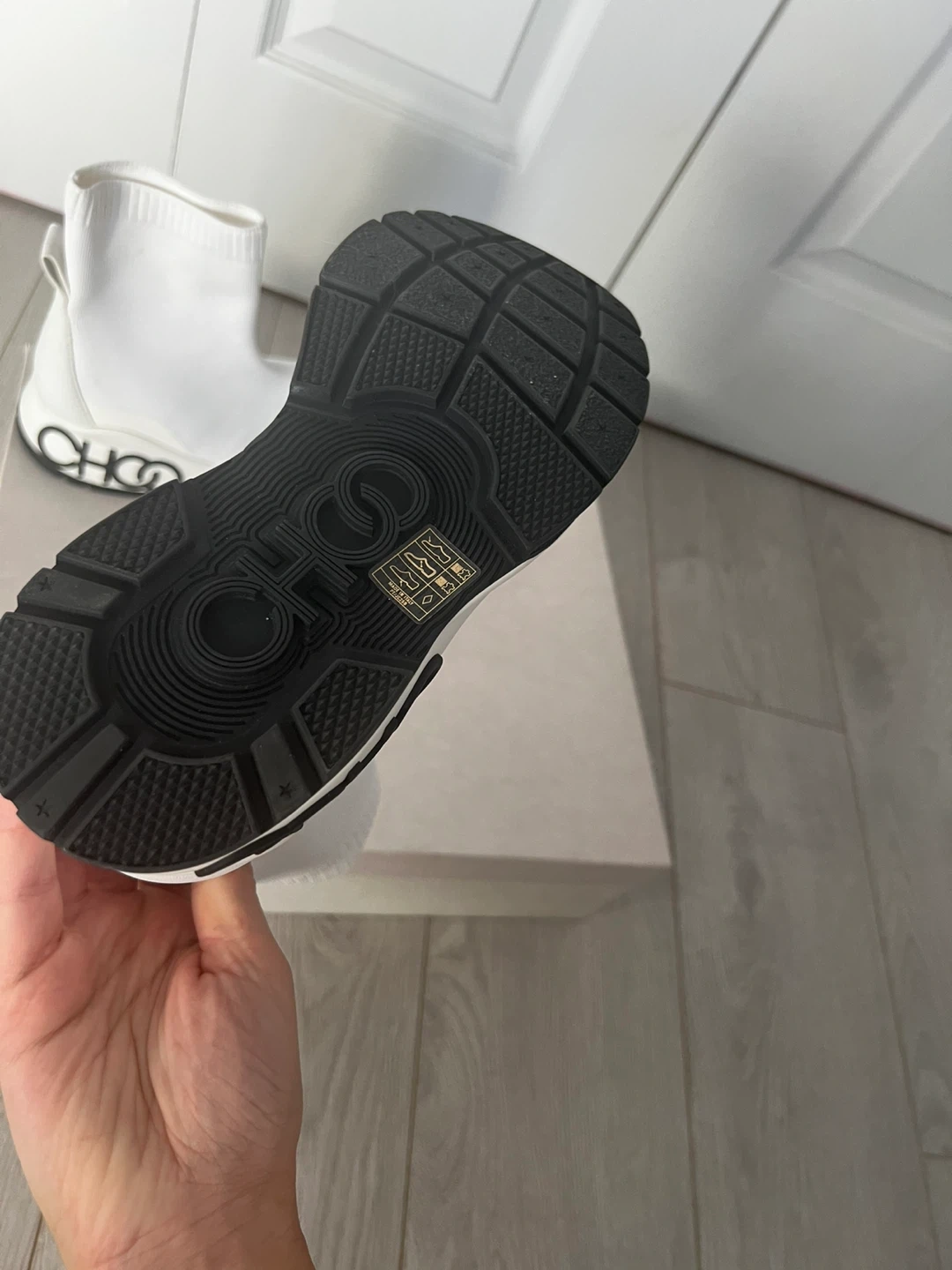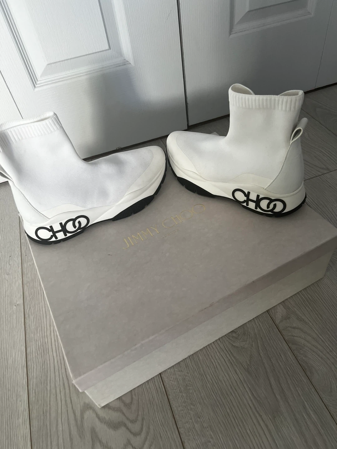 Selling a pair of Jimmy Choo white neoprene sock boots! They are in great condition and come with the box. These stylish boots feature the Jimmy Choo logo on the side and a comfortable sock-like fit. Perfect for adding a touch of luxury to your wardrobe!