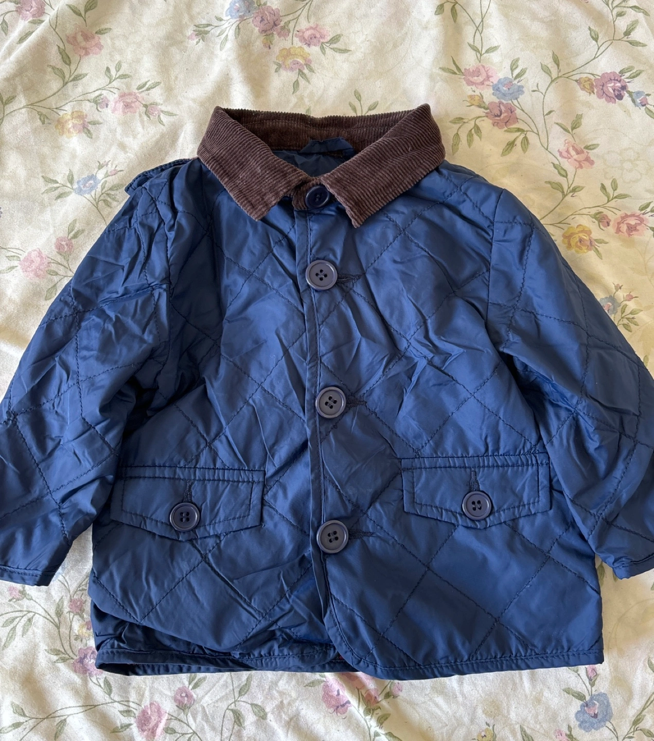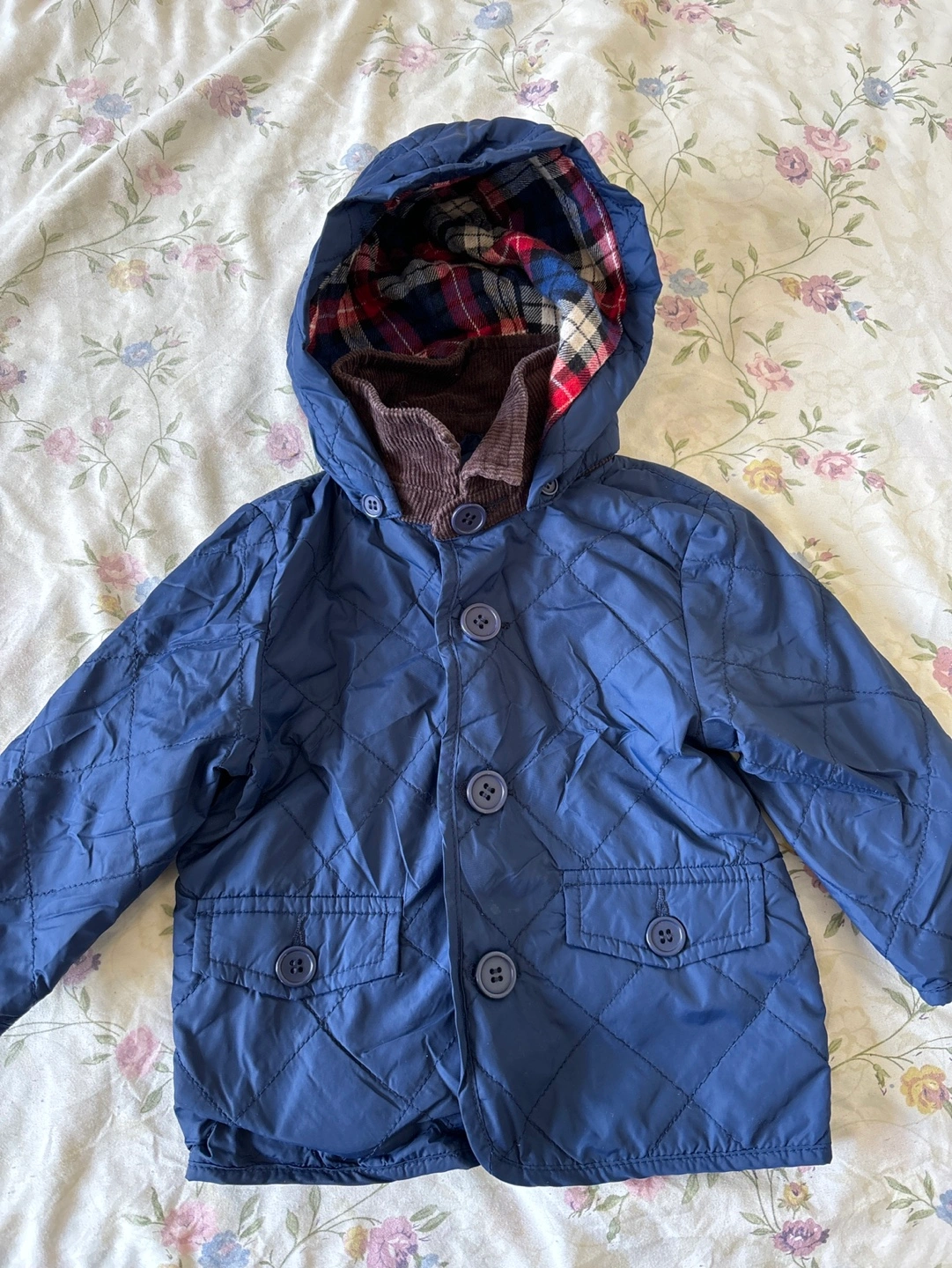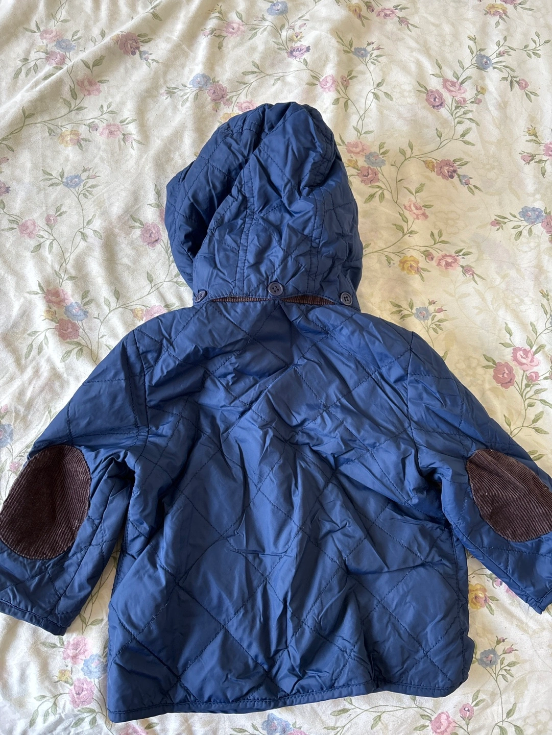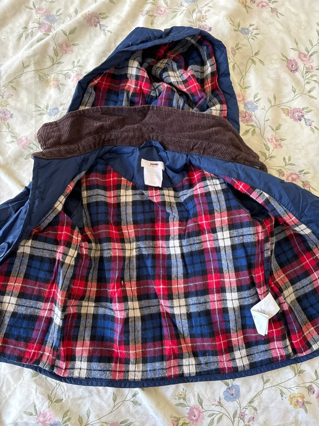 Blue quilted jacket with a corduroy collar, elbow patches, and lining. Has a plaid hood lining. Hood can be taken off and wear as a jacket In a Pet Free and Smoke Free Home Pick up only