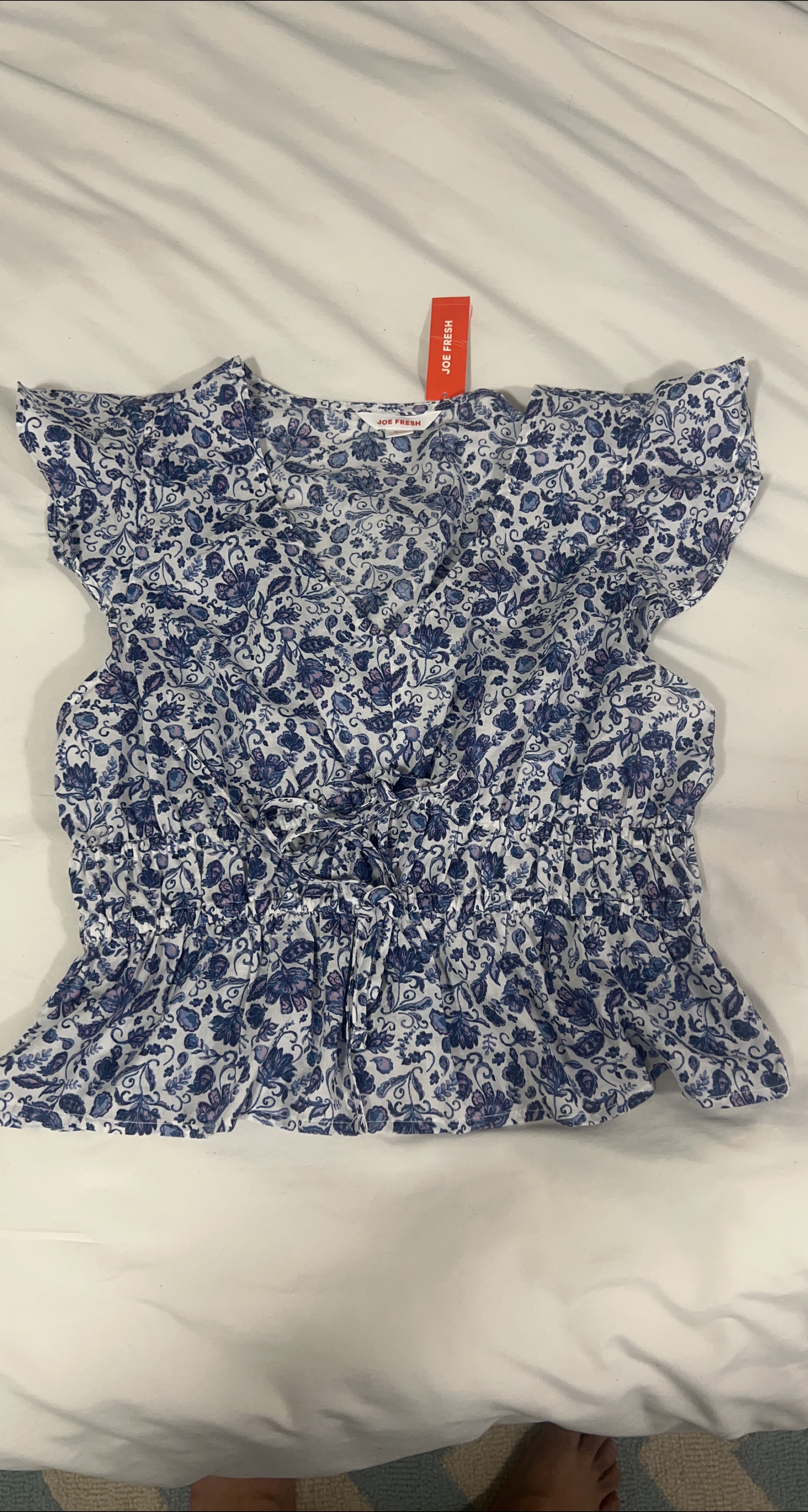 Cute Joe Fresh top with a blue and white floral print! It features a flattering V-neck and a comfortable, cinched waist. Perfect for a casual summer day!