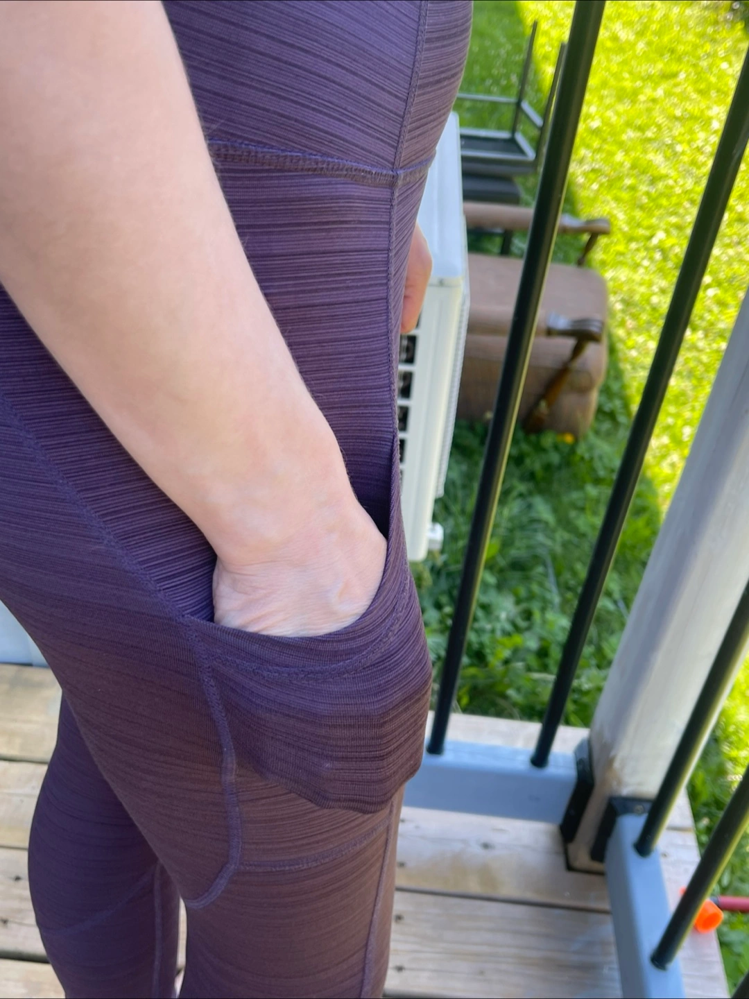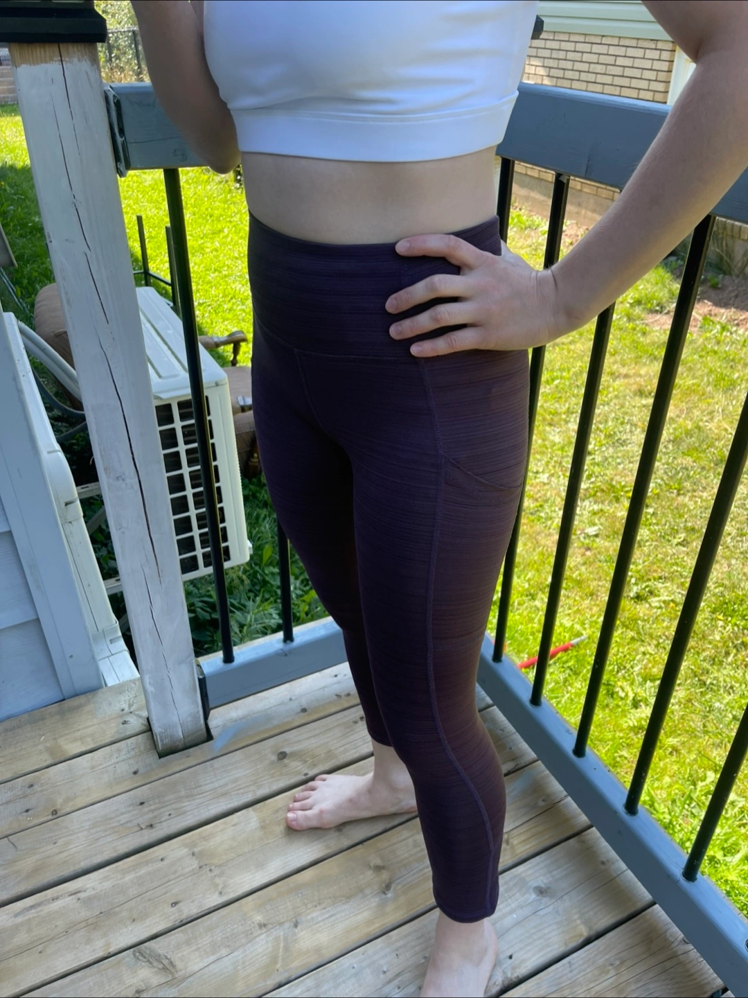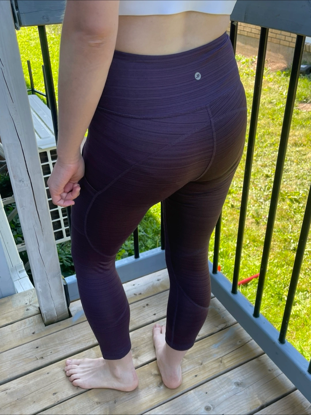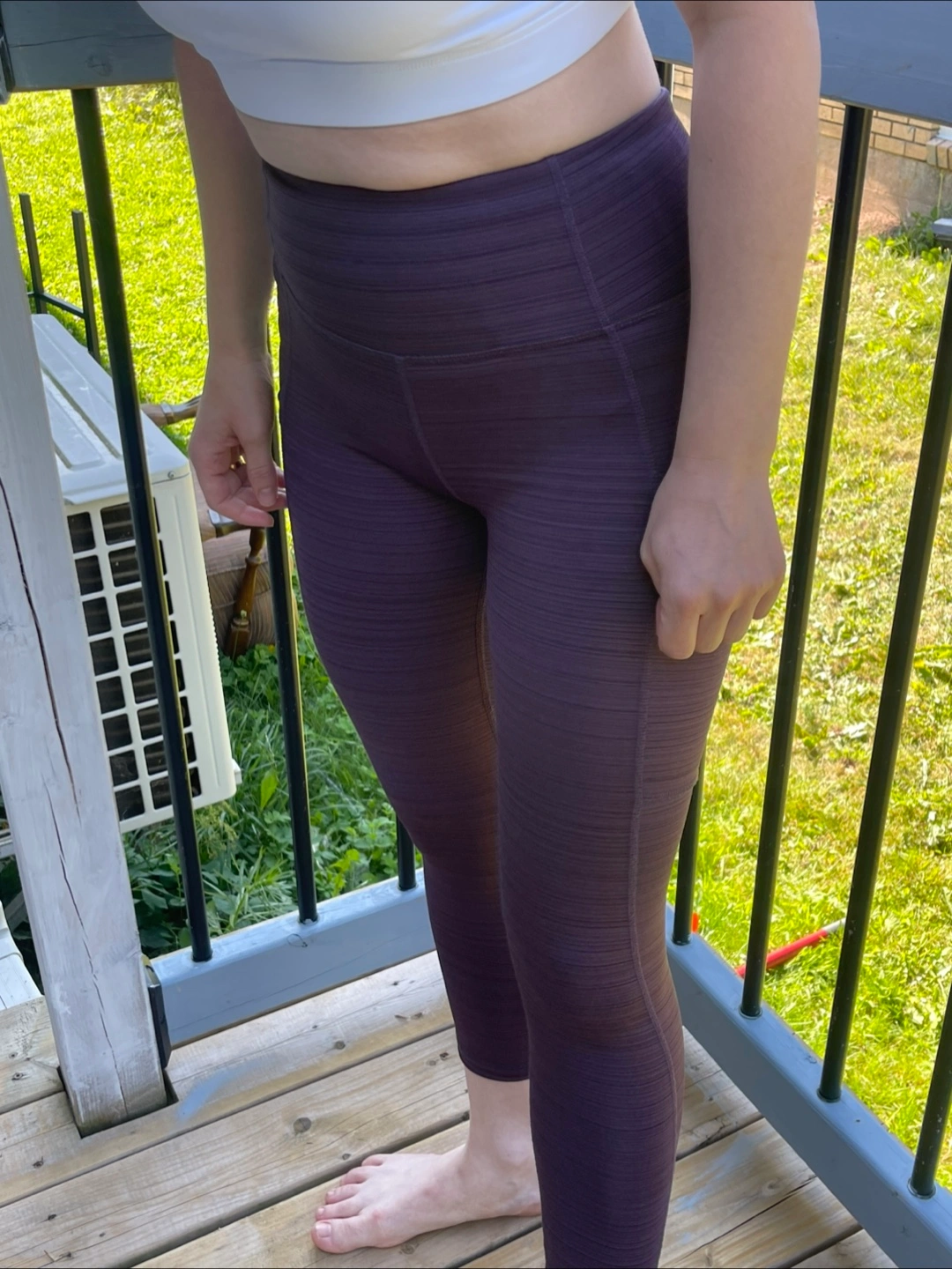 Selling a pair of Joe Fresh leggings in a lovely purple striped pattern. They look great and are super comfy for workouts or just lounging around! Size - S Model size in the photo - M.
