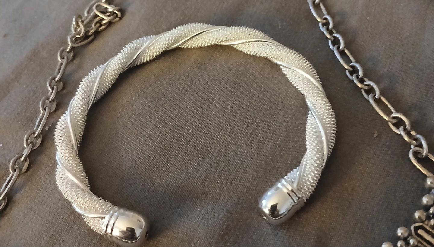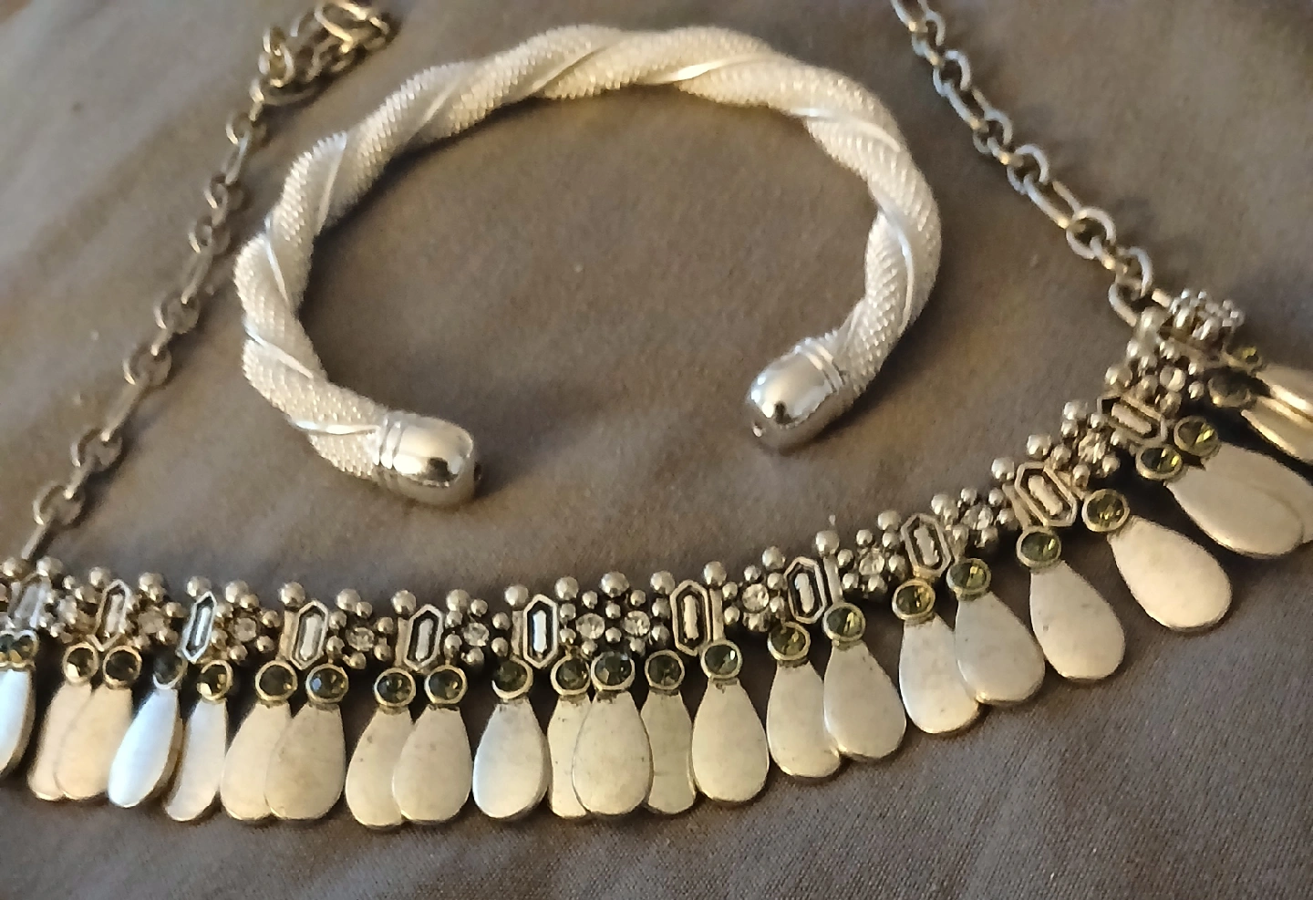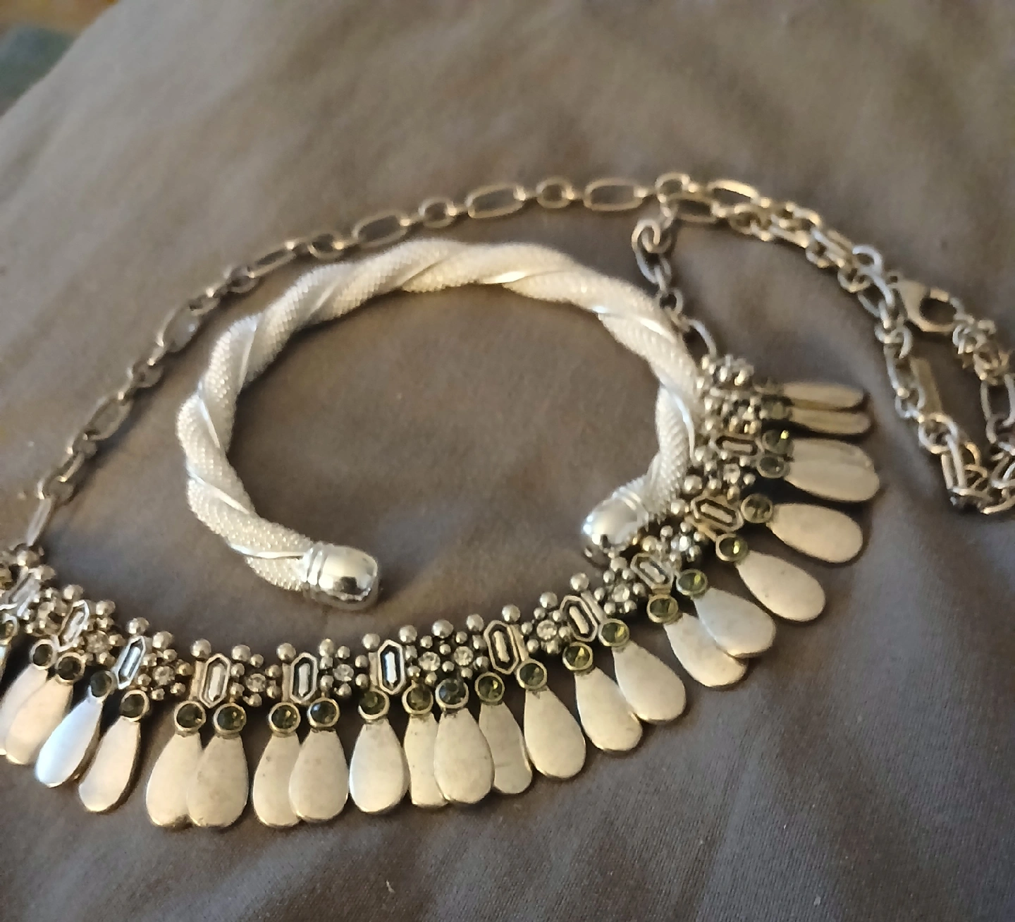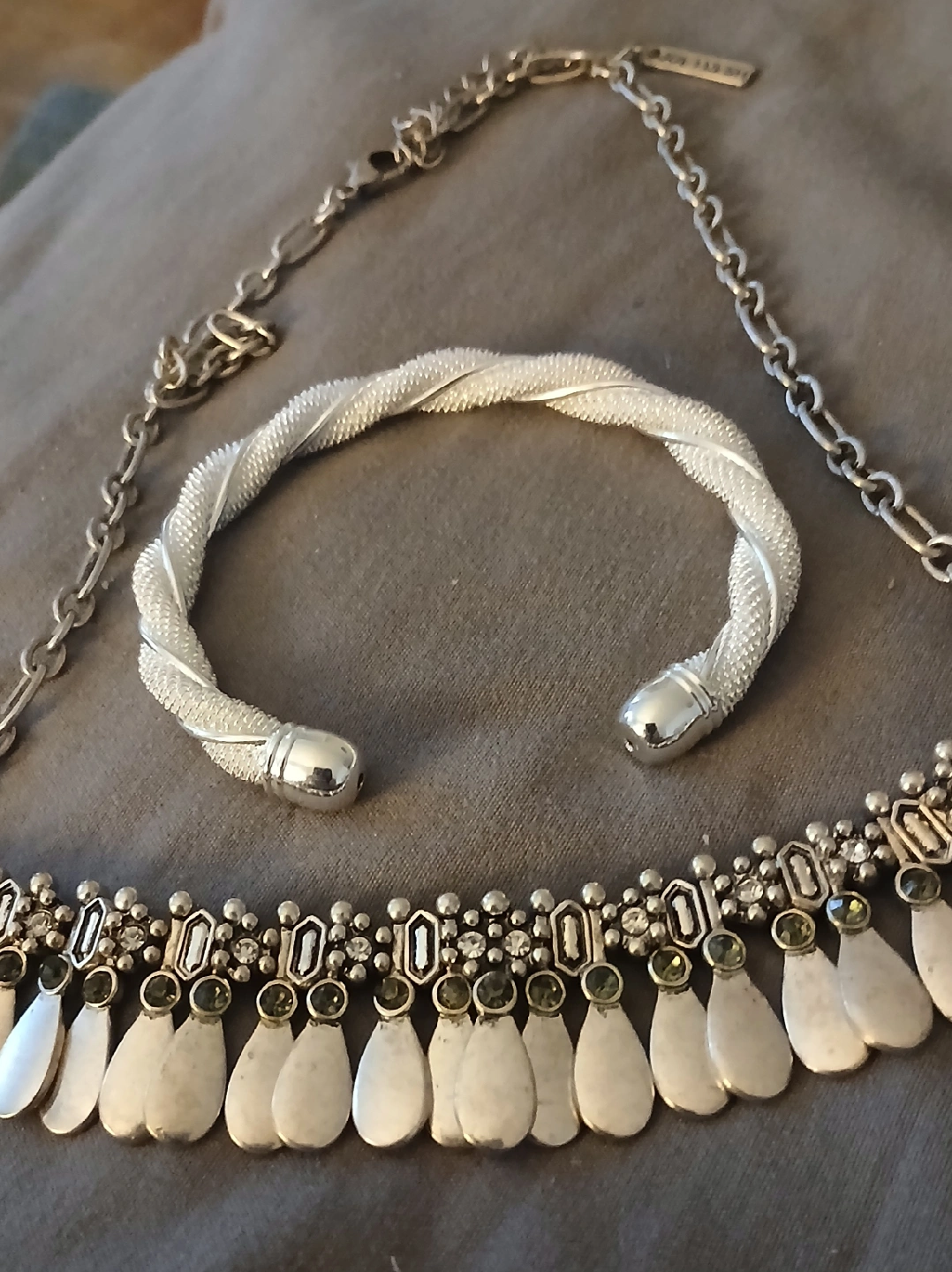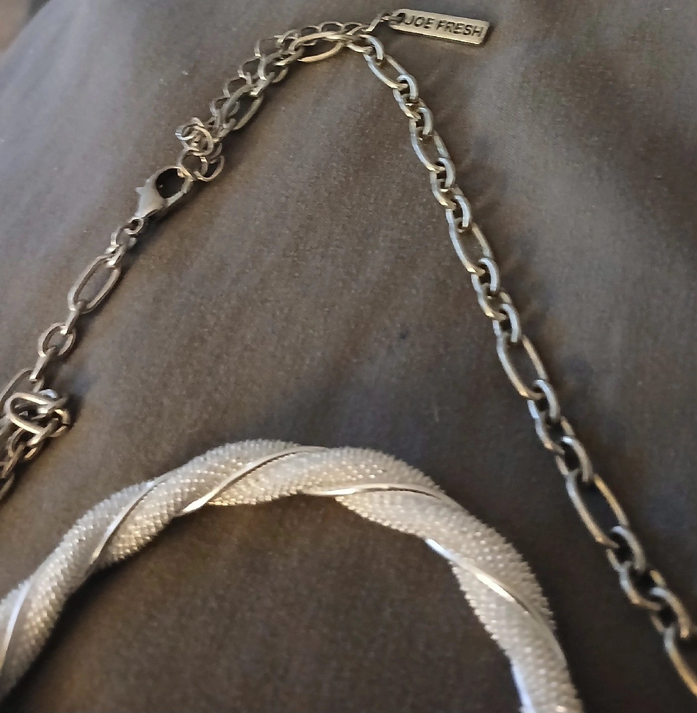 Selling a lovely silver-tone necklace and bangle set from Joe Fresh! The necklace has a pretty design, and the bangle is a unique twisted style. bangle is adjustable necklace 18 inches