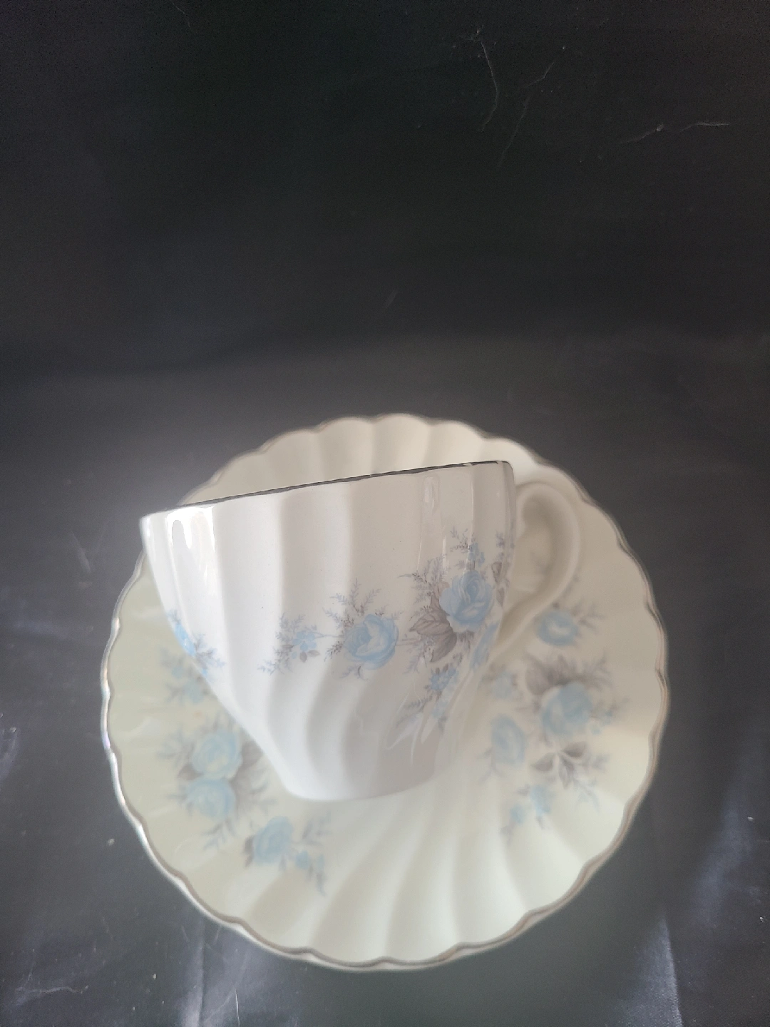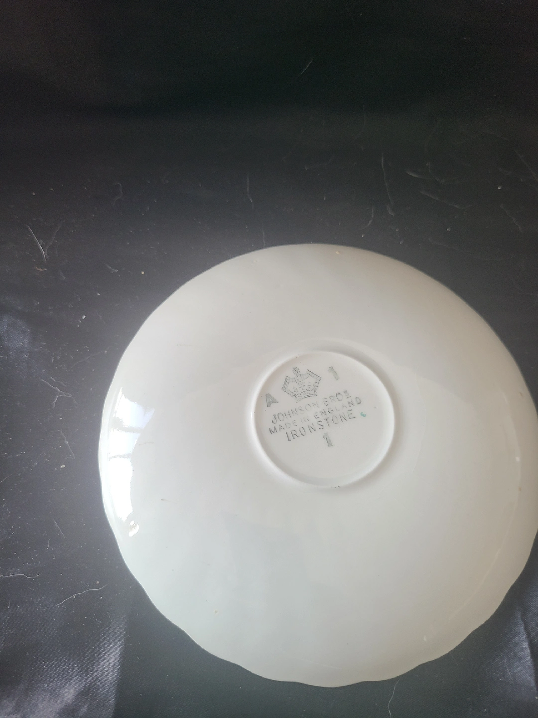 Johnson Bros Ironstone tea cup and saucer set. The set features a delicate blue floral design on a white background. The bottom of the saucer indicates it's made in England.