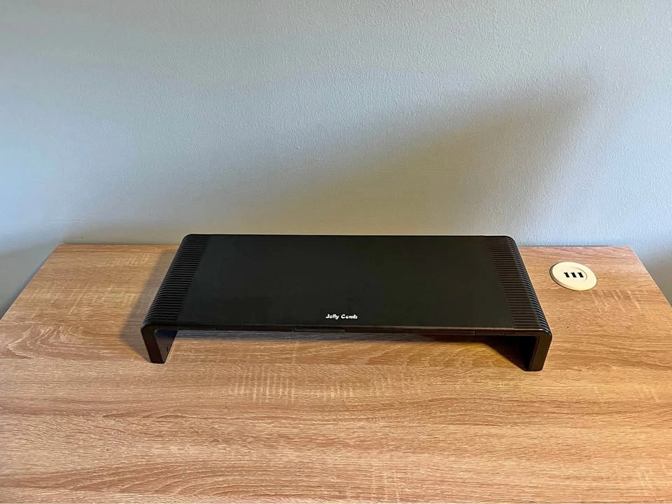 Elevate your workspace with this Jolly Comb monitor stand, designed to improve ergonomics and organization. This stand is in good, used condition, ready to declutter your desk while lifting your monitor to a more comfortable viewing height. Here are some features of this stand: * Brand: Jolly Comb * Colour: Black * Material: Durable composite * Features: Includes pull-out storage drawers Two available, $20 each or $35 for both!