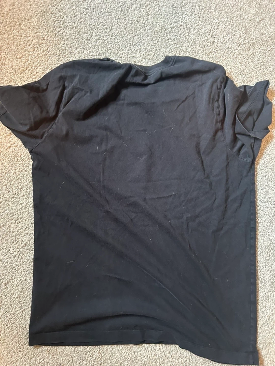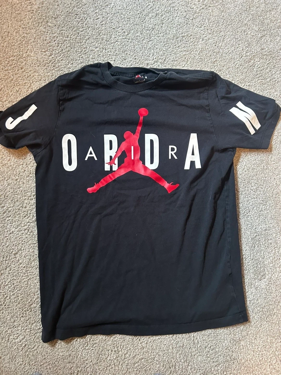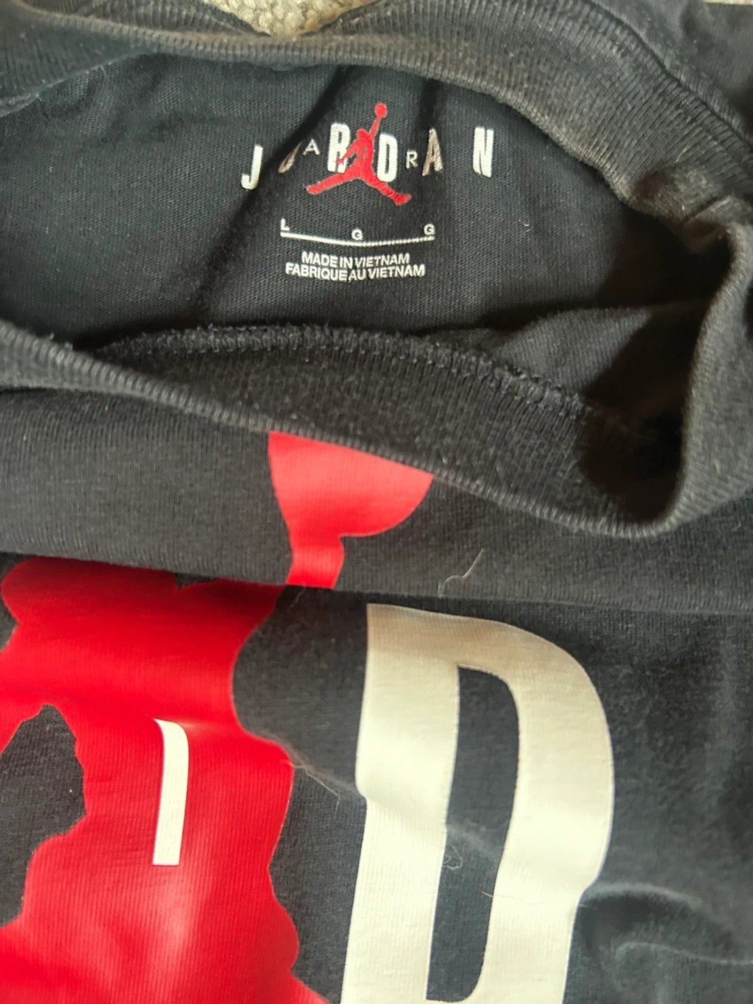 Selling a Jordan t-shirt in size large! It's black with a red and white graphic on the front. It's in good condition.