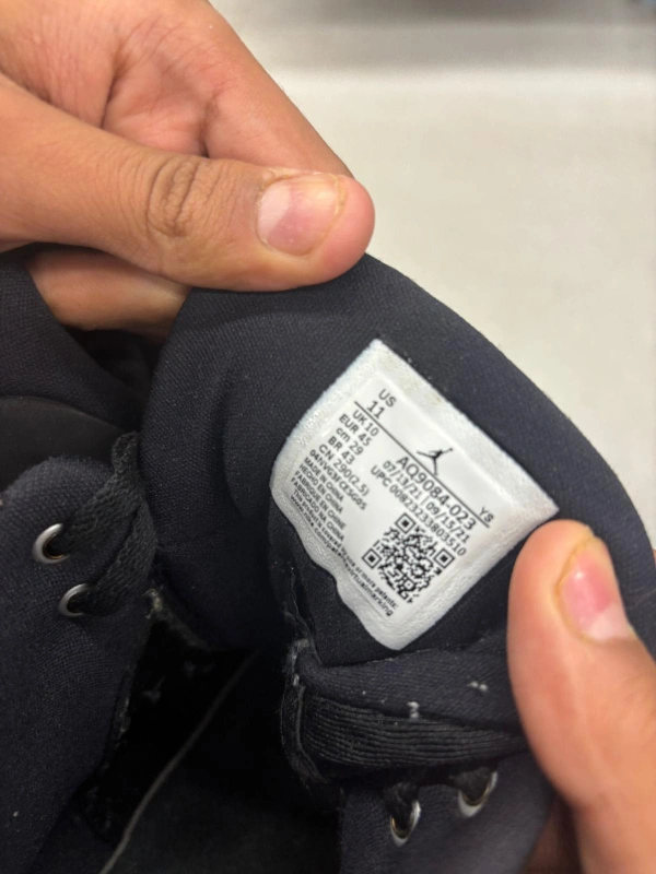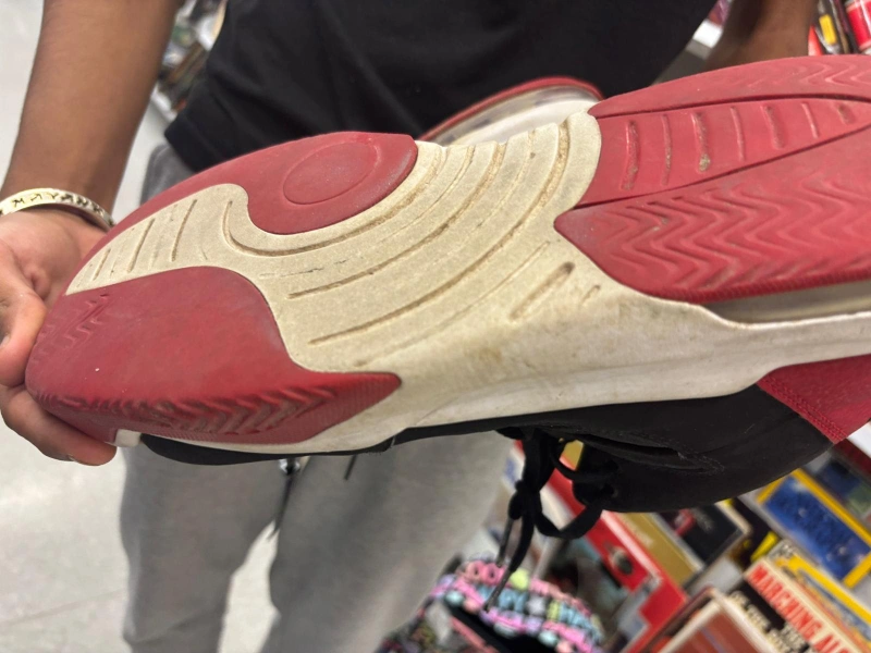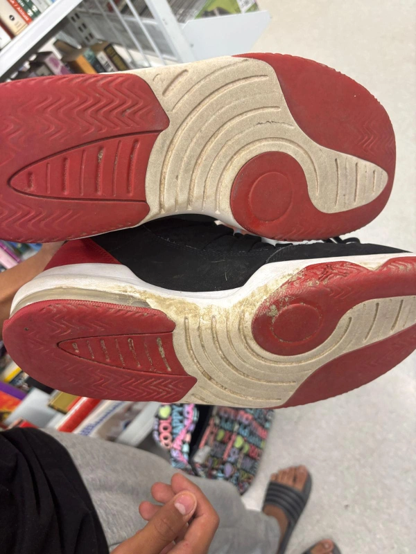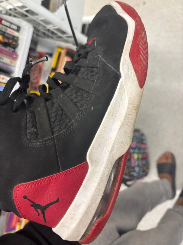 Selling a pair of Jordan Max Aura 4 sneakers in black and red, size 11. They show some signs of wear, especially on the soles, but still have lots of life left!