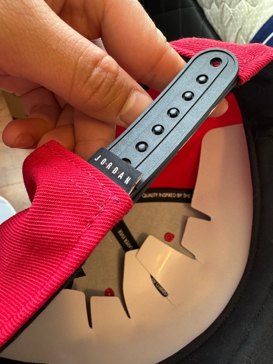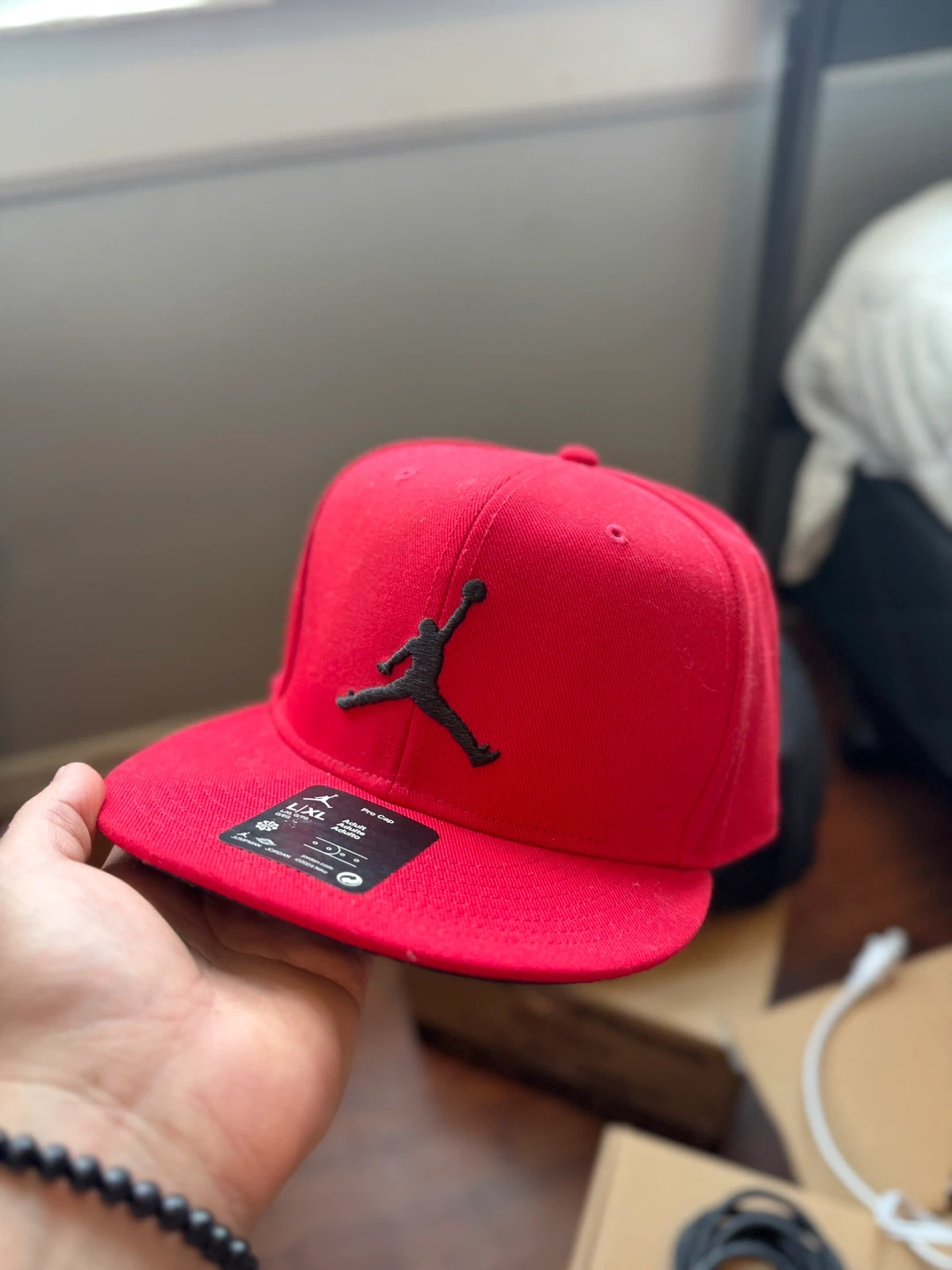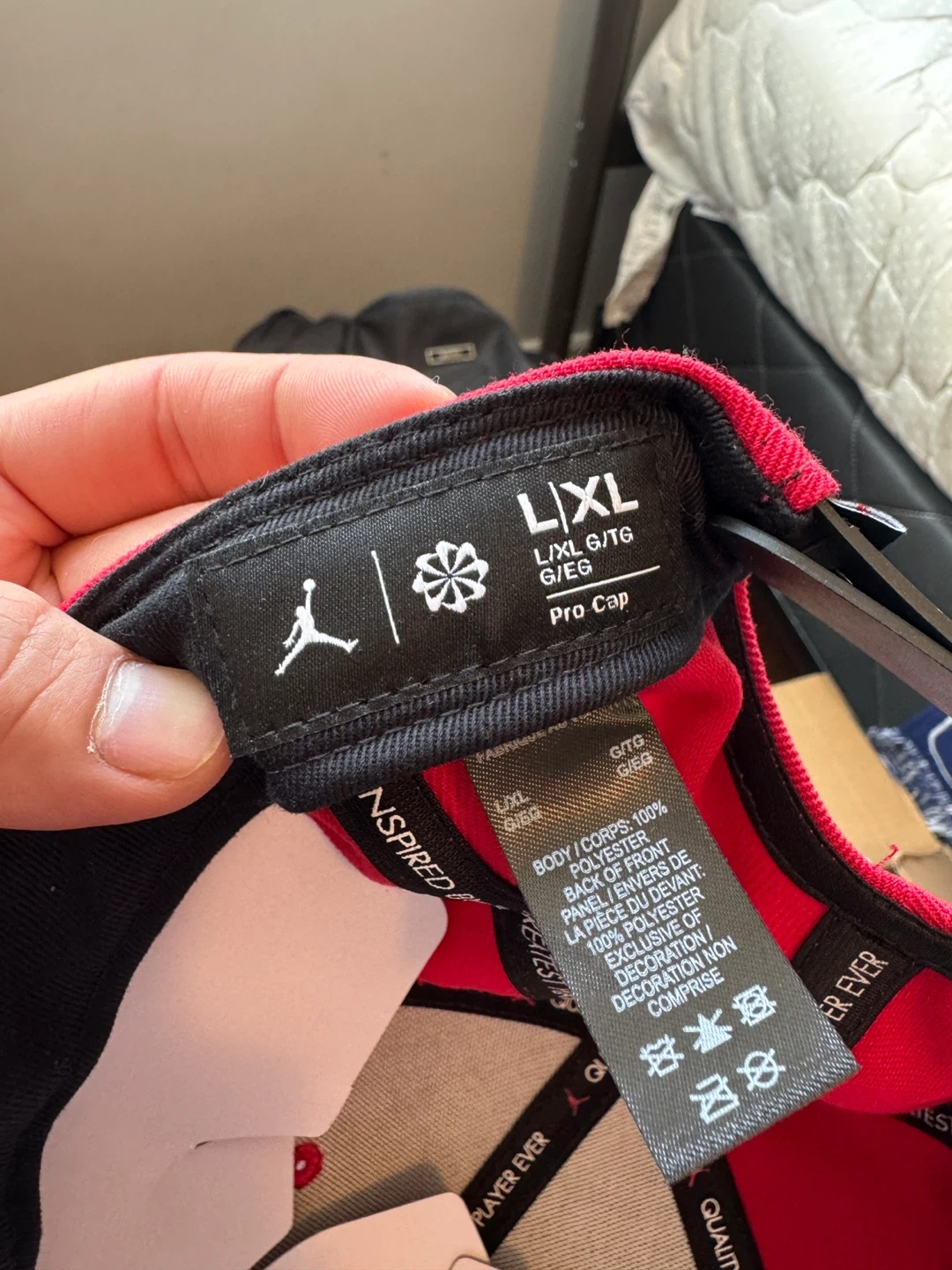 Selling a Jordan Pro Cap in red, size L/XL. It features the iconic Jordan logo. The cap is made of 100% polyester for the body and back panel. It's a stylish and comfortable accessory to complete your look!