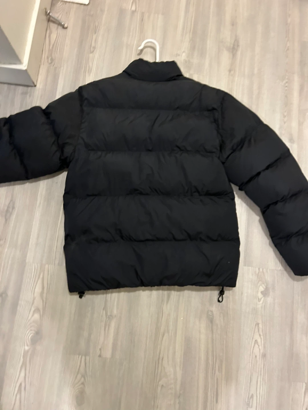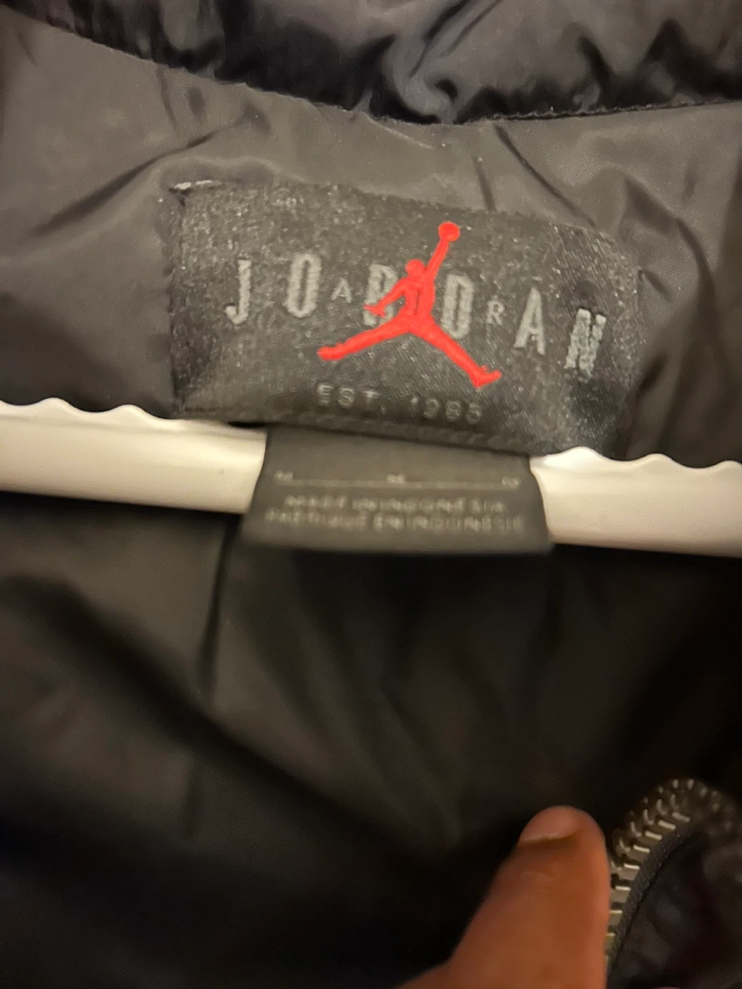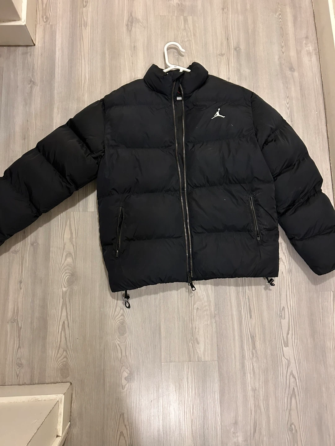 Cozy black Jordan puffer jacket in size medium. Features the iconic Jordan logo. Perfect for staying warm this winter!
