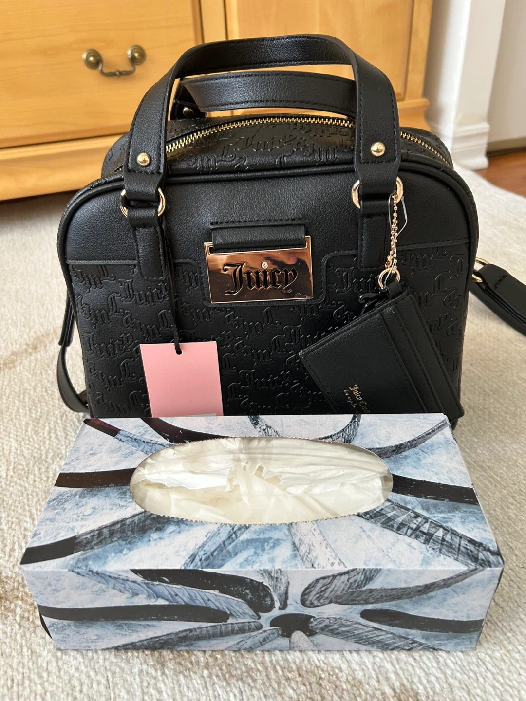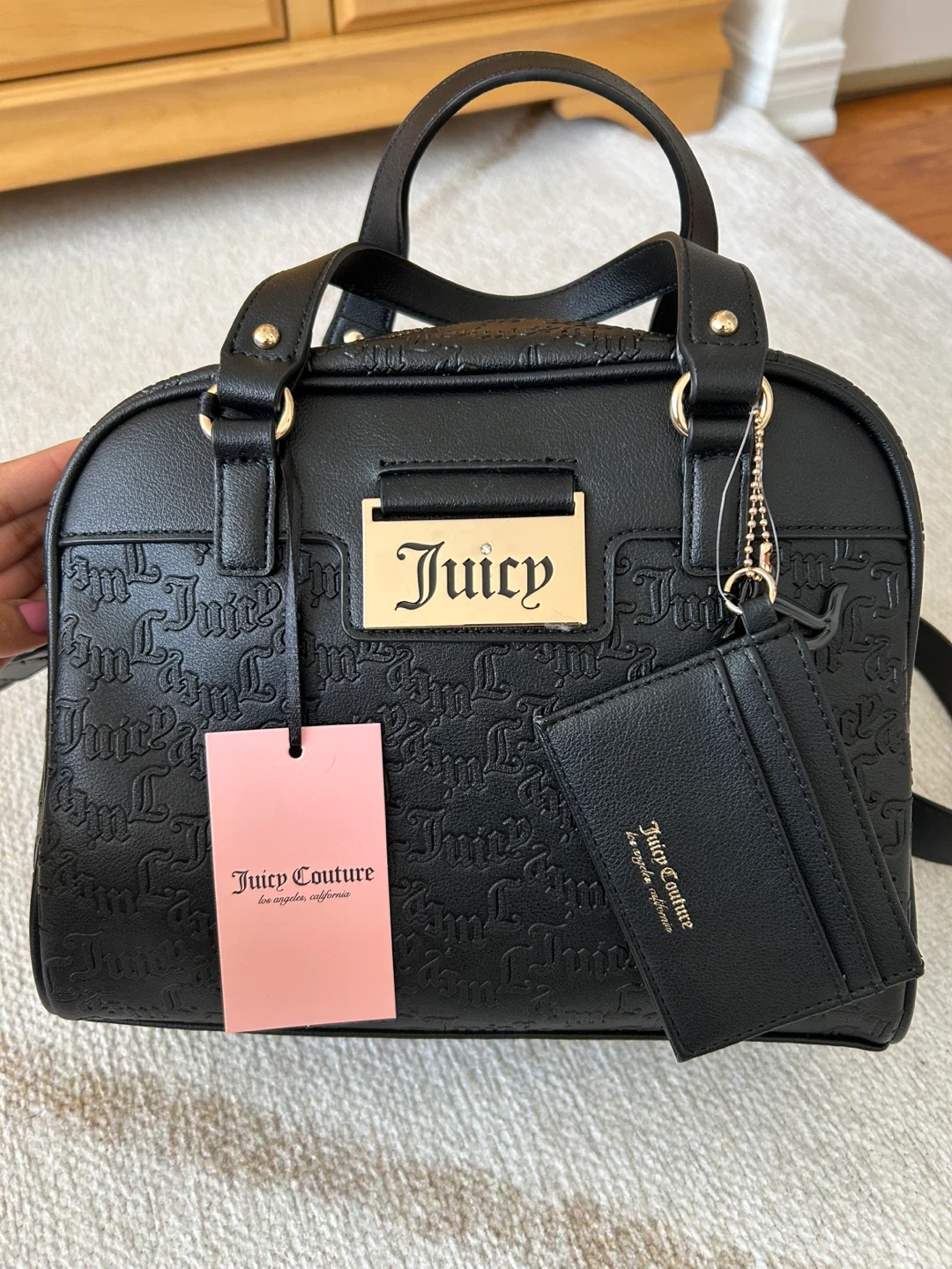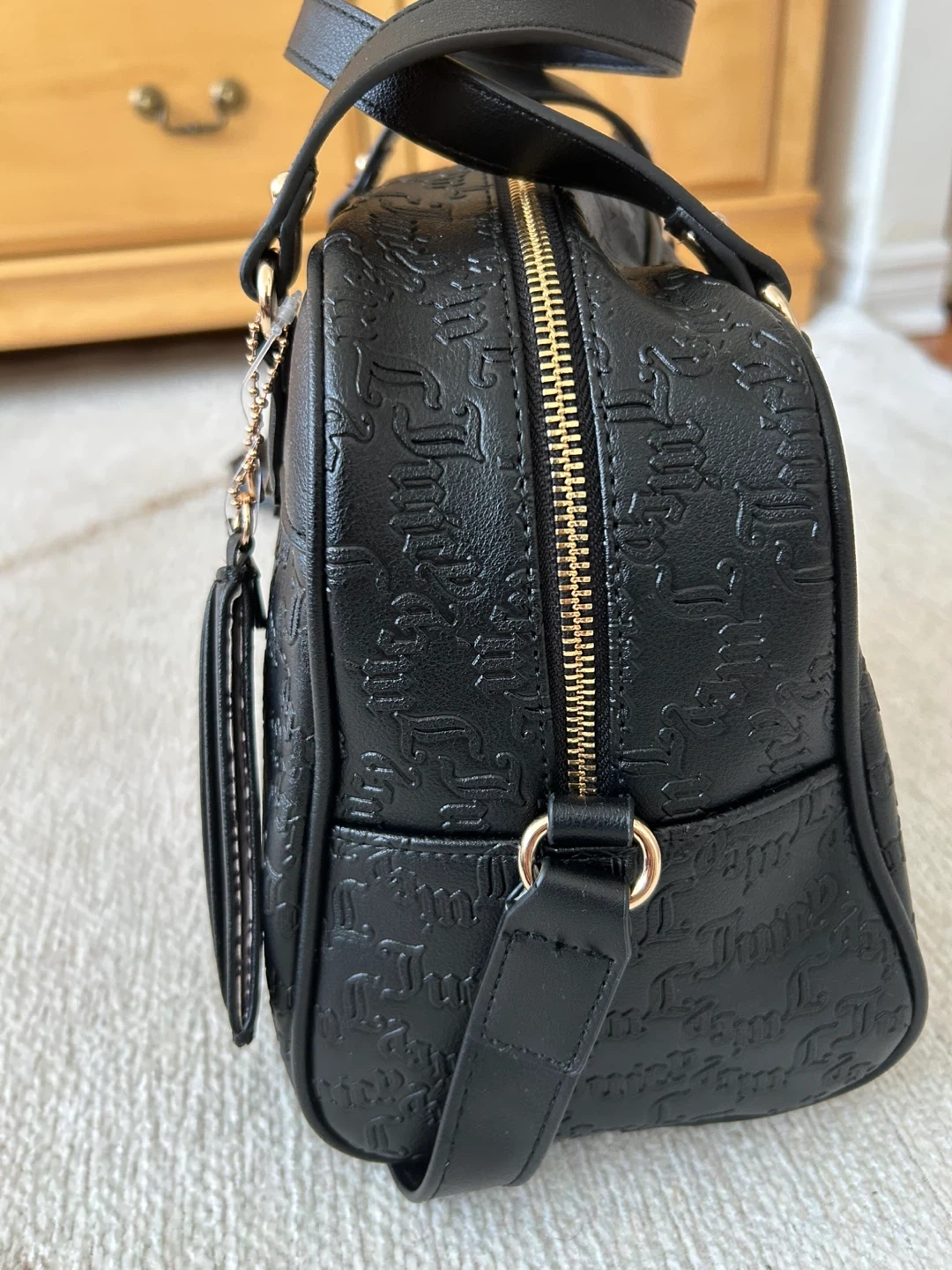Selling a stylish Juicy Couture black embossed dome satchel! It features a unique embossed design, a gold-tone zipper, and the iconic Juicy logo plate. Perfect for adding a touch of glam to your everyday look