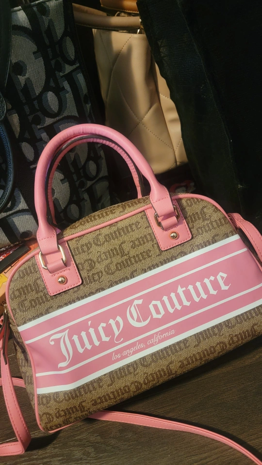 This Juicy Couture barrel bag is so cute! It features a brown body with the Juicy Couture logo printed all over. The handles and accents are a lovely pink. It also has a long strap for shoulder or crossbody wear. Great for adding a touch of Y2K style to any outfit!