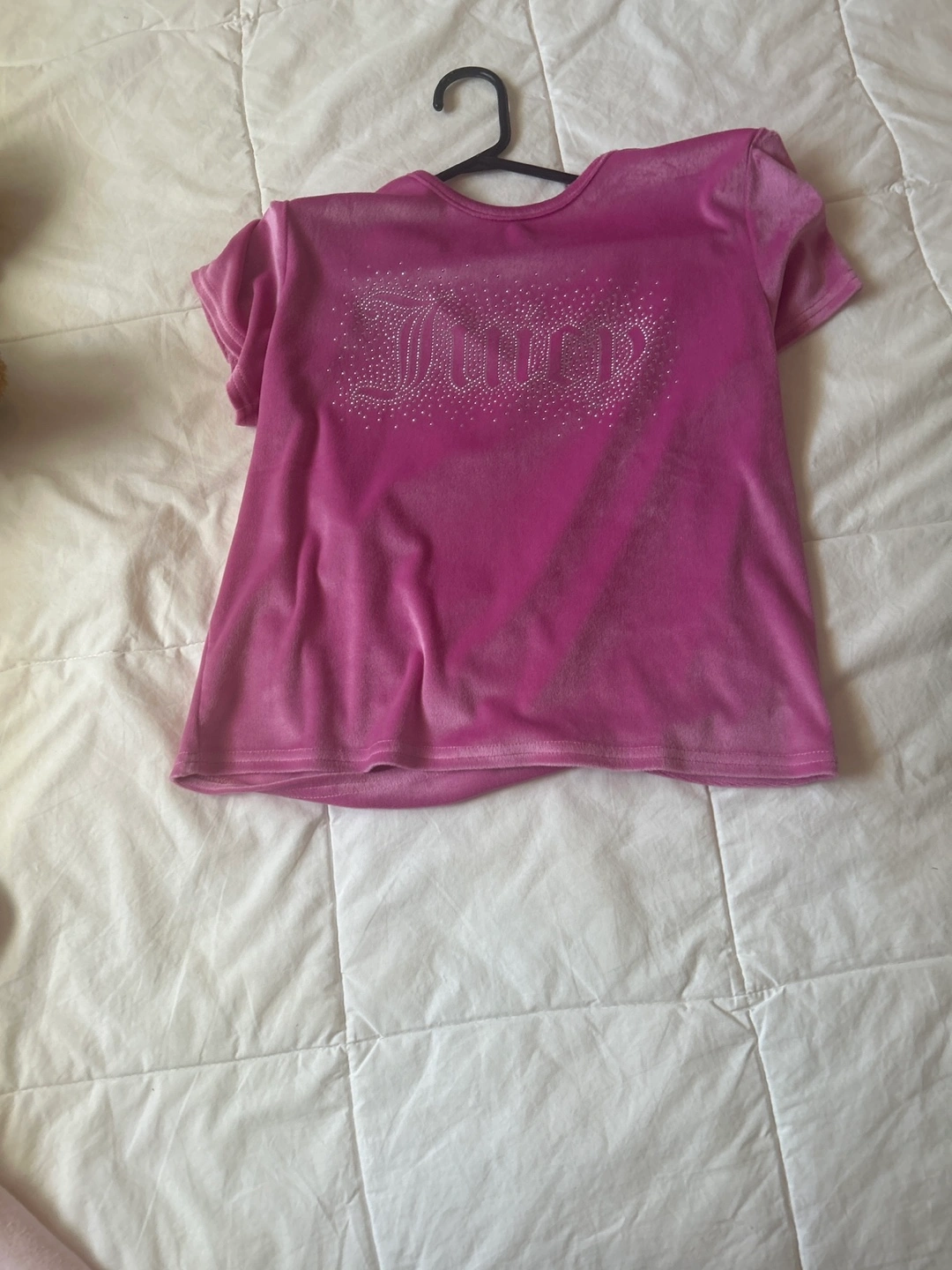 A cute pink velvet t-shirt from Juicy Couture. It's in great condition and has the Juicy logo in rhinestones on the front. Perfect for adding a bit of sparkle to your day!