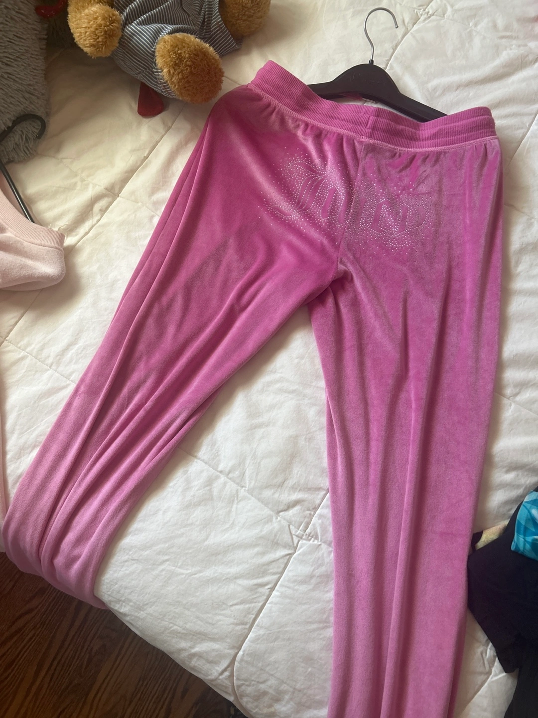 Selling a pair of Juicy Couture pink velour track pants. They're super comfy and in great condition! Perfect for lounging around or running errands. The material is soft and plush, making them a cozy choice for any casual occasion