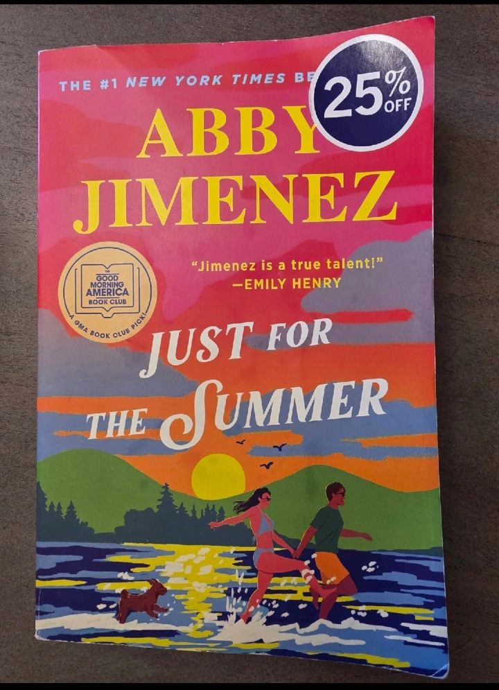 Selling the book "Just for the Summer" by Abby Jimenez! It's a contemporary romance novel, perfect for a light read. The cover has a 25% off sticker. It is part of the Forever on social media series.