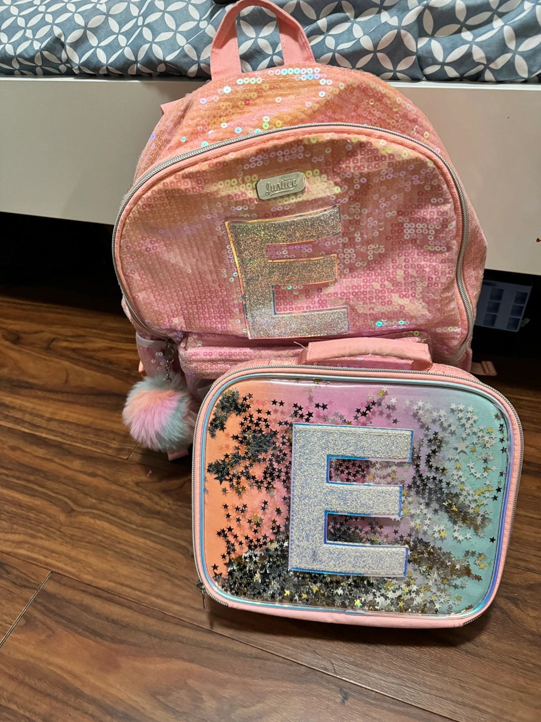 Pink sequin backpack and lunch bag set with a large "E" on both pieces. Comes as a set. Was gently used for kindergarten. Meet up in Bradford. $30 obo