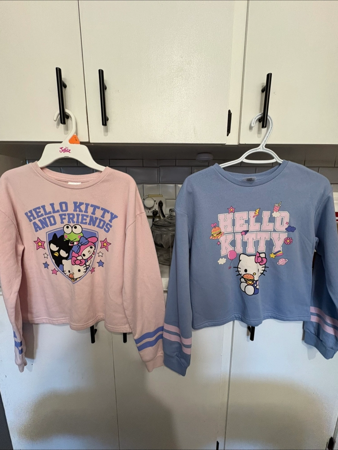 Two adorable Justice crop top sweaters featuring Hello Kitty! One is a light pink with Hello Kitty and Friends, and the other is a light blue with Hello Kitty. Perfect for any Hello Kitty fan! Both size XL 14-16