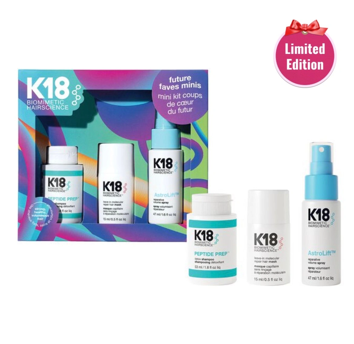 Selling a limited edition K18 Future Faves Minis Kit! This kit includes: - Peptide Prep Detox Shampoo (1.8 fl oz) - Leave-In Molecular Repair Hair Mask (0.5 fl oz) - AstroLift Reparative Volume Spray (1.6 fl oz)