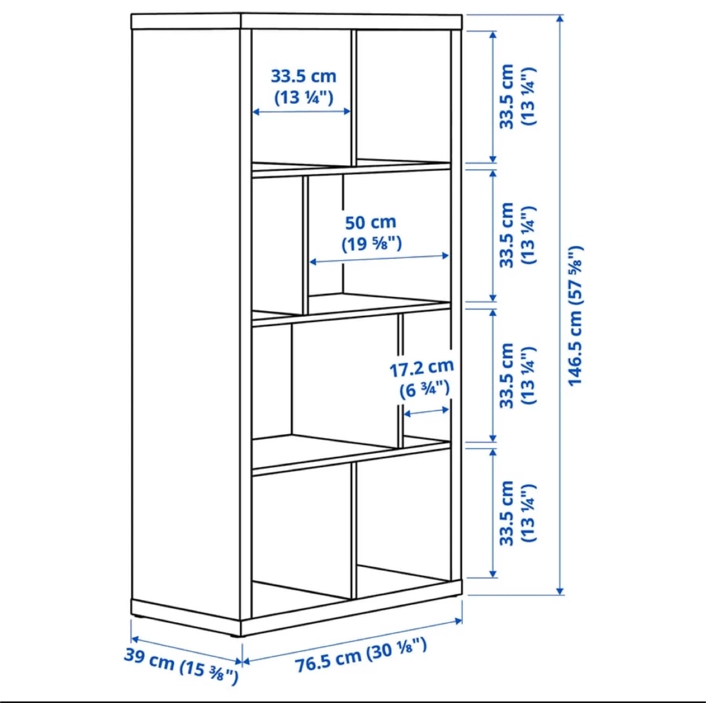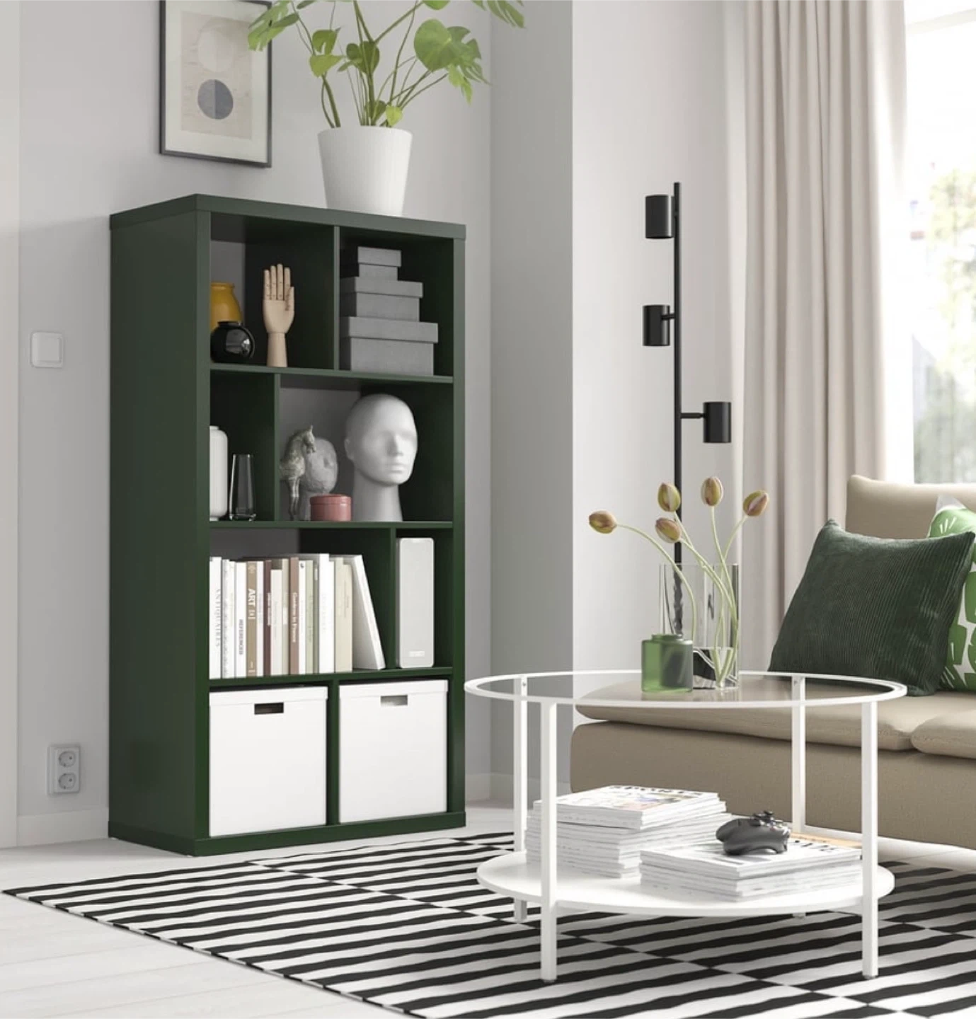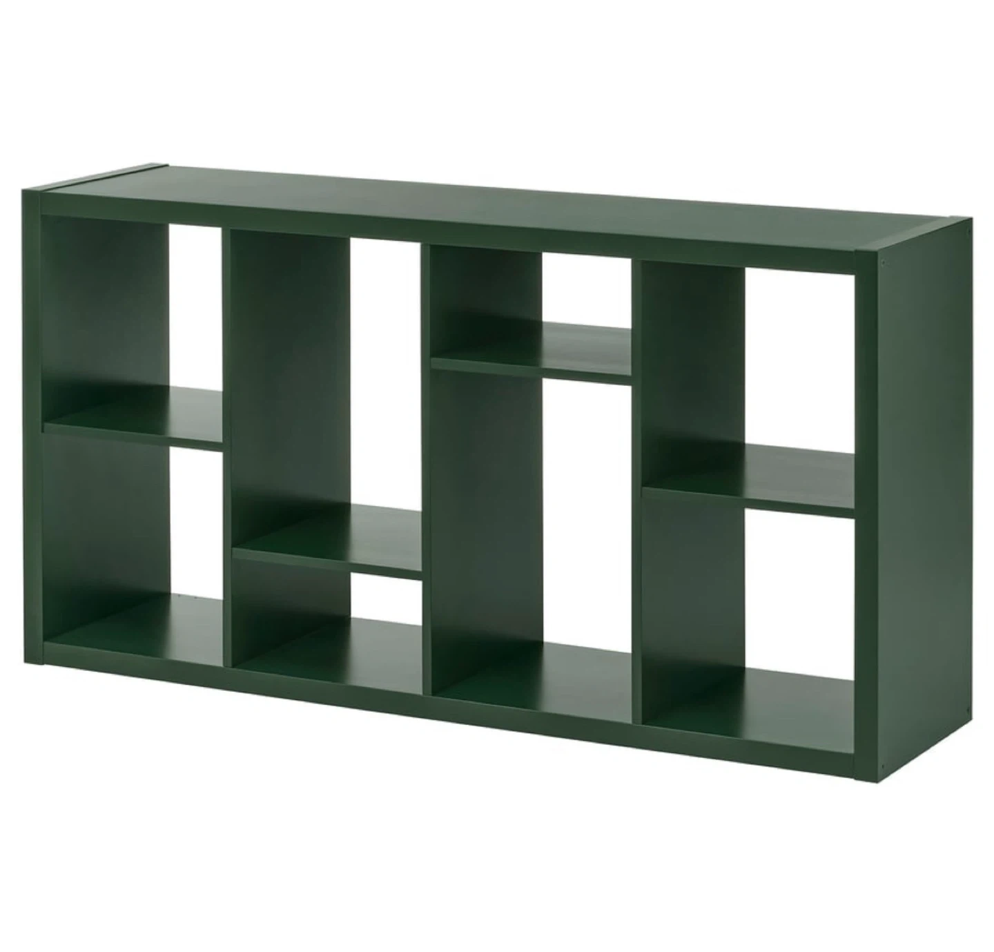 Kallax shelf unit in green. It's in great shape and ready to organize your space! The dimensions are approximately 146.5 cm (57 5/8") tall, 76.5 cm (30 1/8") wide, and 39 cm (15 3/8") deep. Each compartment is about 33.5 cm (13 1/4") x 33.5 cm (13 1/4"), with one section being 50 cm (19 5/8") wide and another smaller section at 17.2 cm (6 3/4")