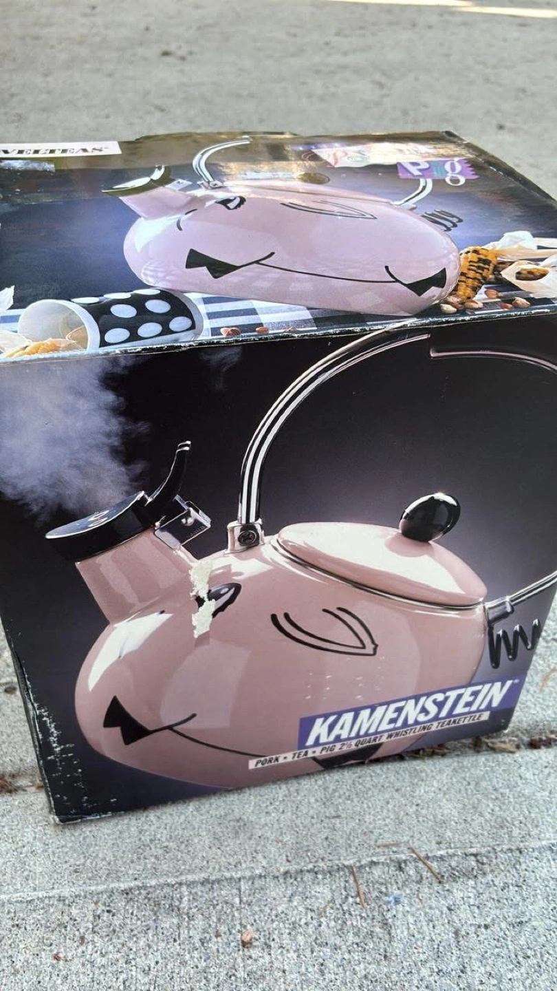 Kamenstein Novelteas Pork Tea Pig 2½ Quart Whistling Teakettle! Vintage. 1994. This cute kettle is perfect for any tea lover. Light weight enamel /steel feel with phenolic handle and knob. BNIB.