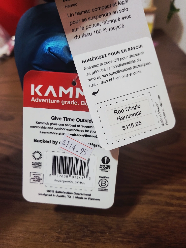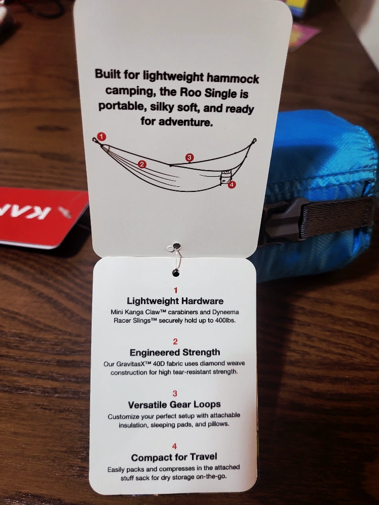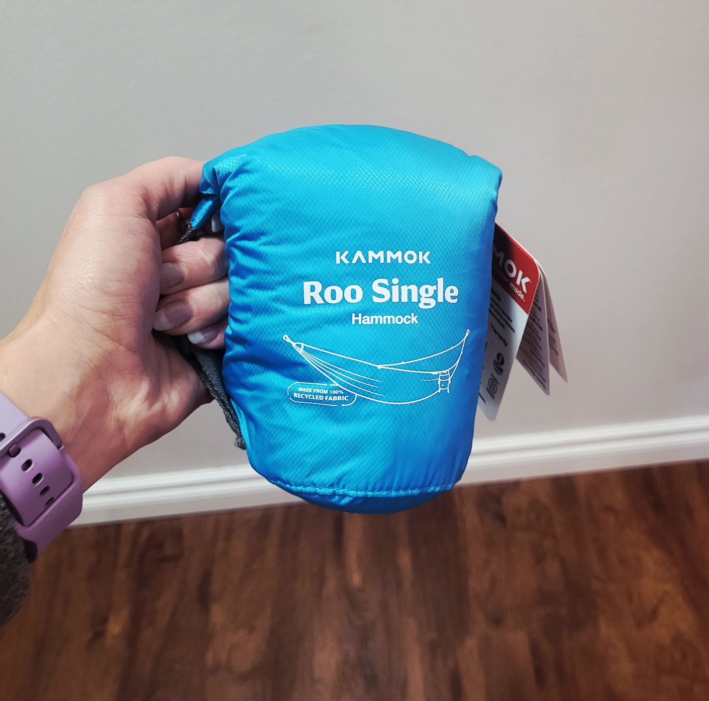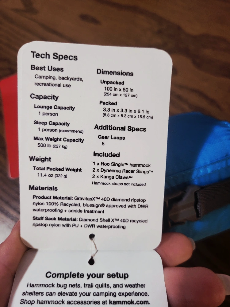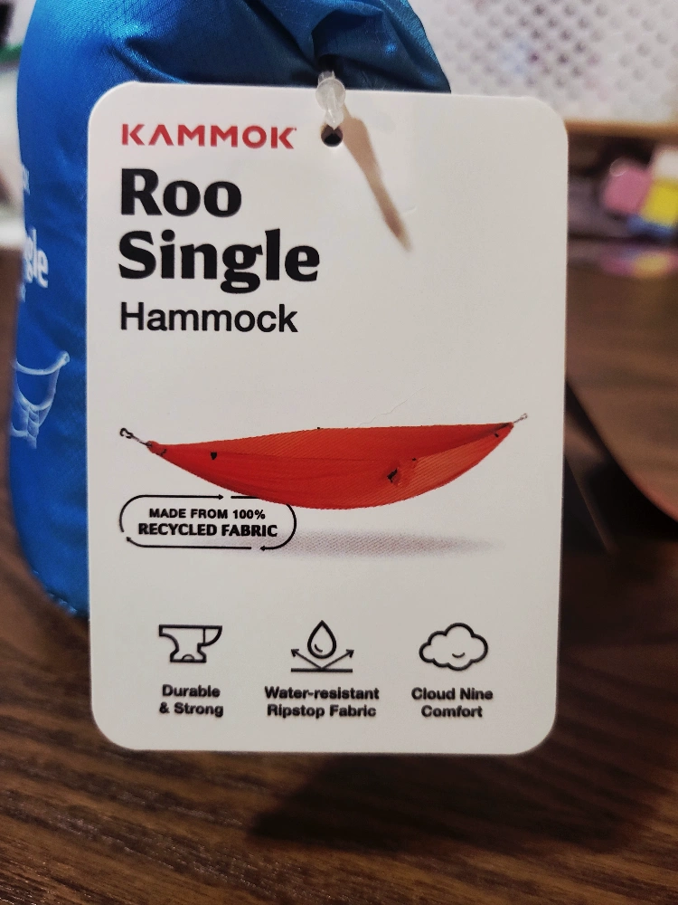 Selling a brand new Kammok Roo Single Hammock! It's still in its original packaging. Here are some of the specs: - Best for camping, backyards, and recreational use - Lounge capacity for 1 person - Sleep capacity for 1 person (recommended) - Max weight capacity: 500 lb (227 kg) - Total packed weight: 11.4 oz (322 g) The material is GravitasX 40D diamond ripstop nylon, 100% recycled, bluesign approved with DWR waterproofing + crinkle treatment. The stuff sack material is Diamond Shell X 40D recycled ripstop nylon with PU + DWR waterproofing