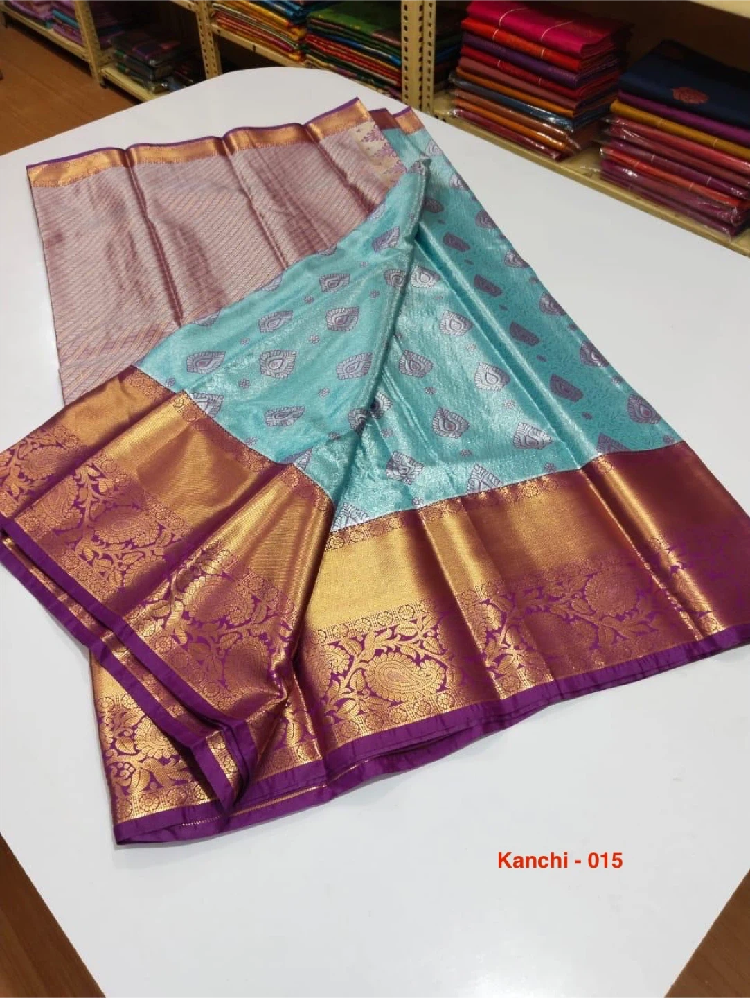 Beautiful Kanchi silk saree in a lovely shade of blue with gold detailing! The intricate patterns and vibrant colours make it perfect for special occasions or adding a touch of elegance to your wardrobe