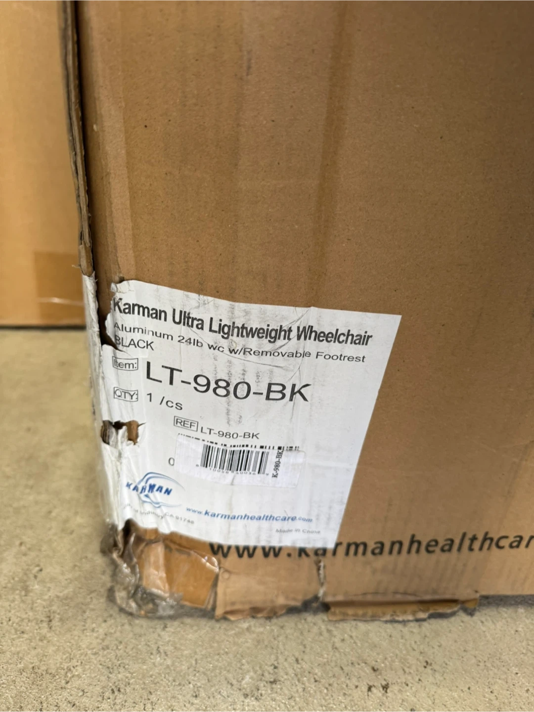 Selling a Karman Ultra Lightweight Wheelchair, model LT-980-BK. This wheelchair is made of aluminum and weighs only 24lbs. It also comes with a removable footrest. It is black in colour and comes with the original box!