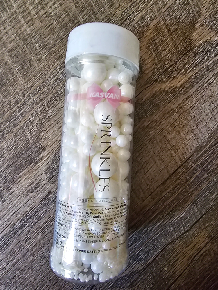 Selling a bottle of KASVAN sprinkles, perfect for decorating cakes and other treats! The bottle contains approximately 130g of white pearl sprinkles. Manufacturing Date: 2025 May 23 Expiry Date: 2026 November 22