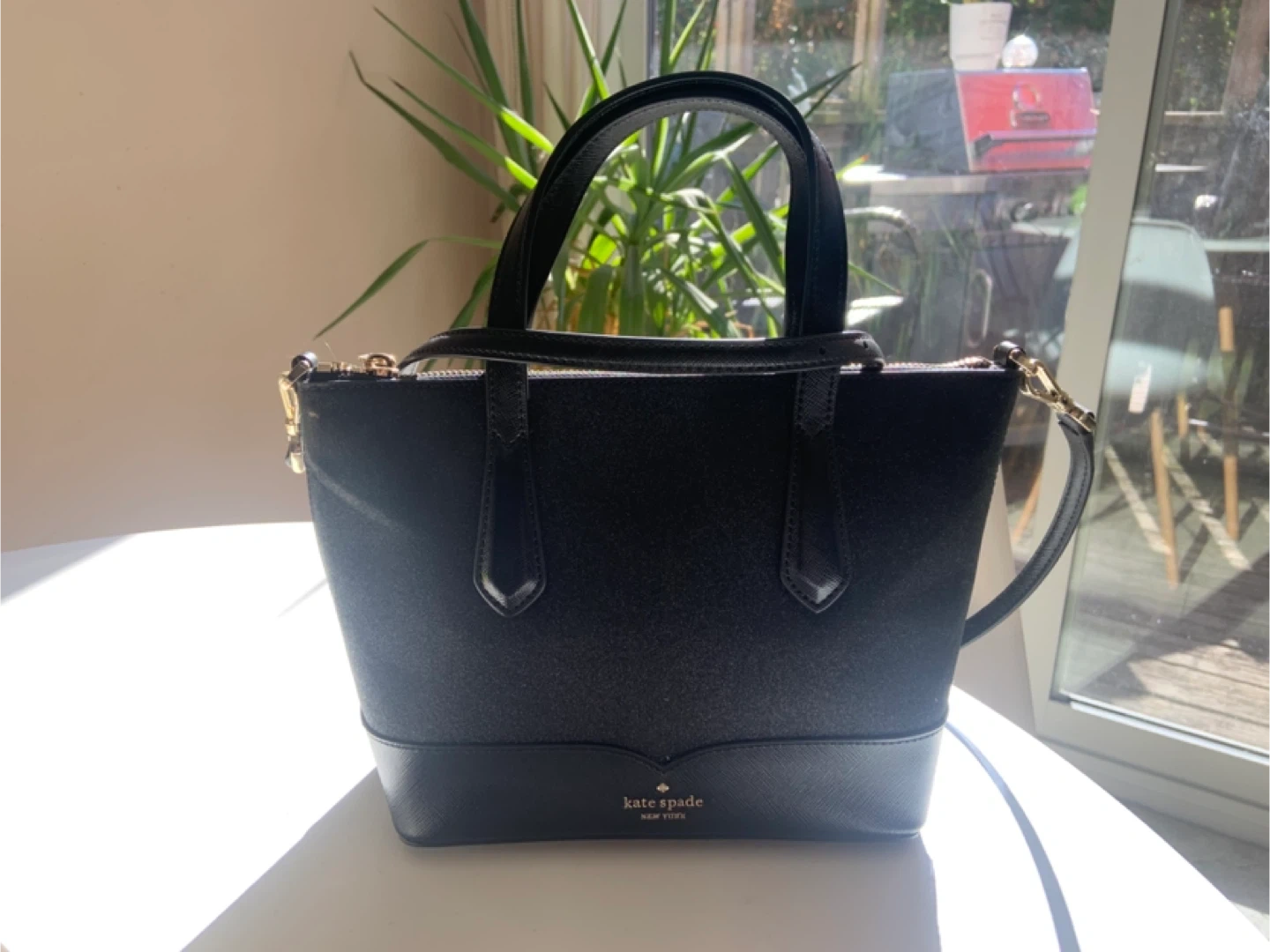 Kate Spade New York Lola Glitter Satchel. Features: zip-top closure and glitter fabric. It has an interior slide pocket and two-way spade jacquard lining. Crossbody strap included. The dimensions are approximately 7 inches (H) x 11 inches (W) x 4.25 inches (D). Please contact me for pickup location $175.00 obo nothing less $100.00 New condition. Never worn.