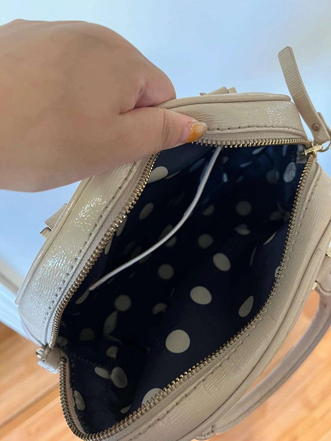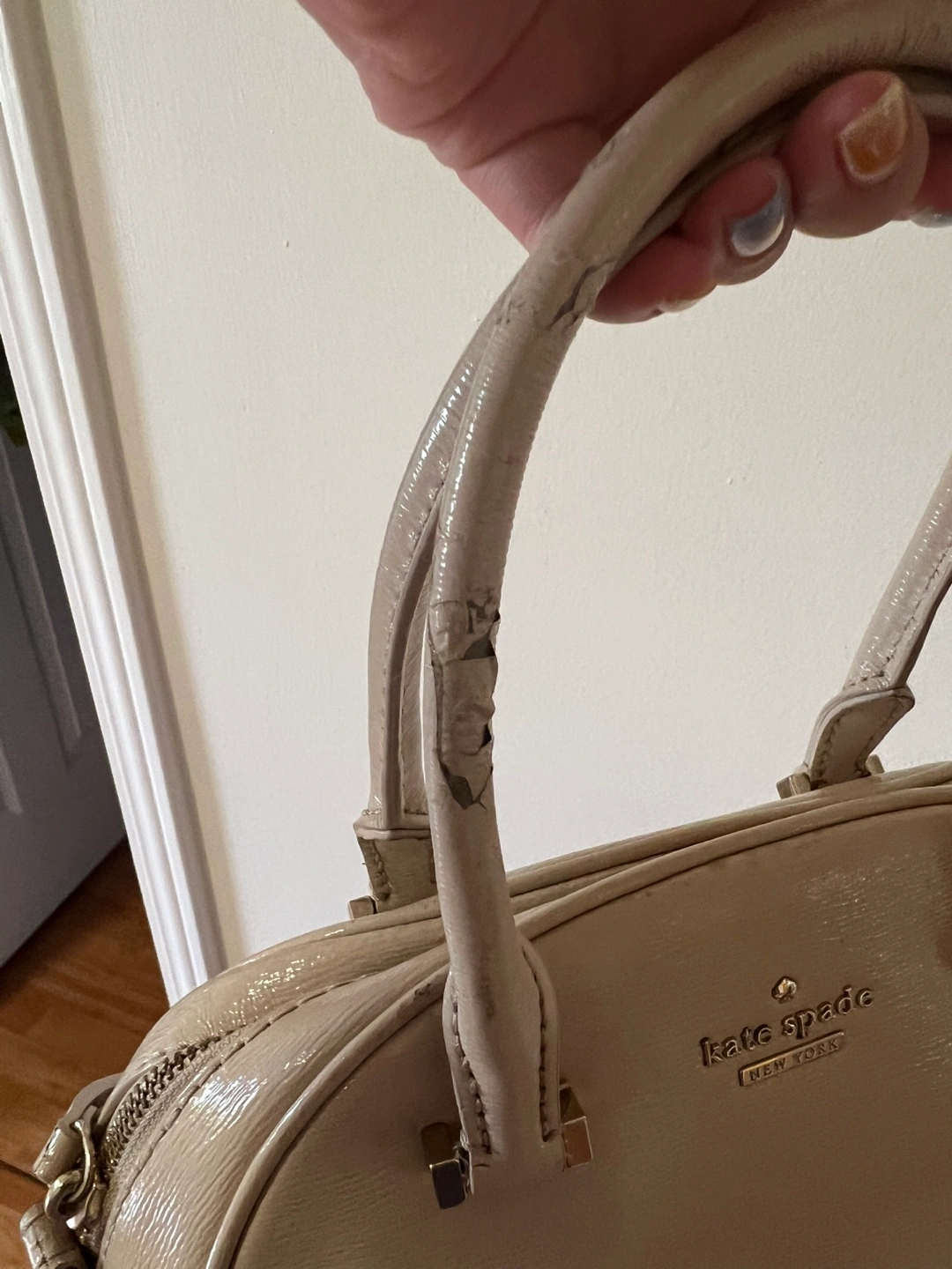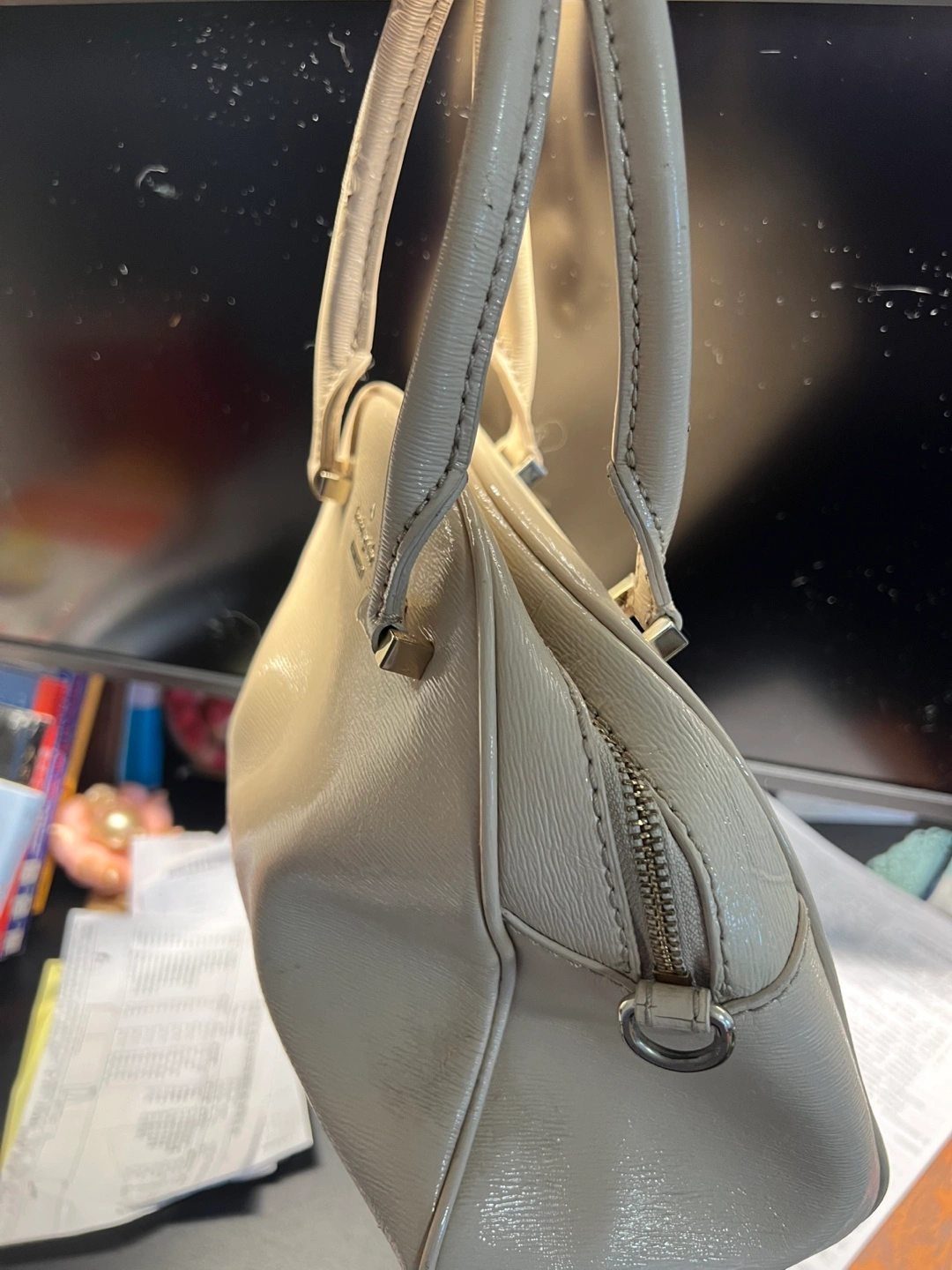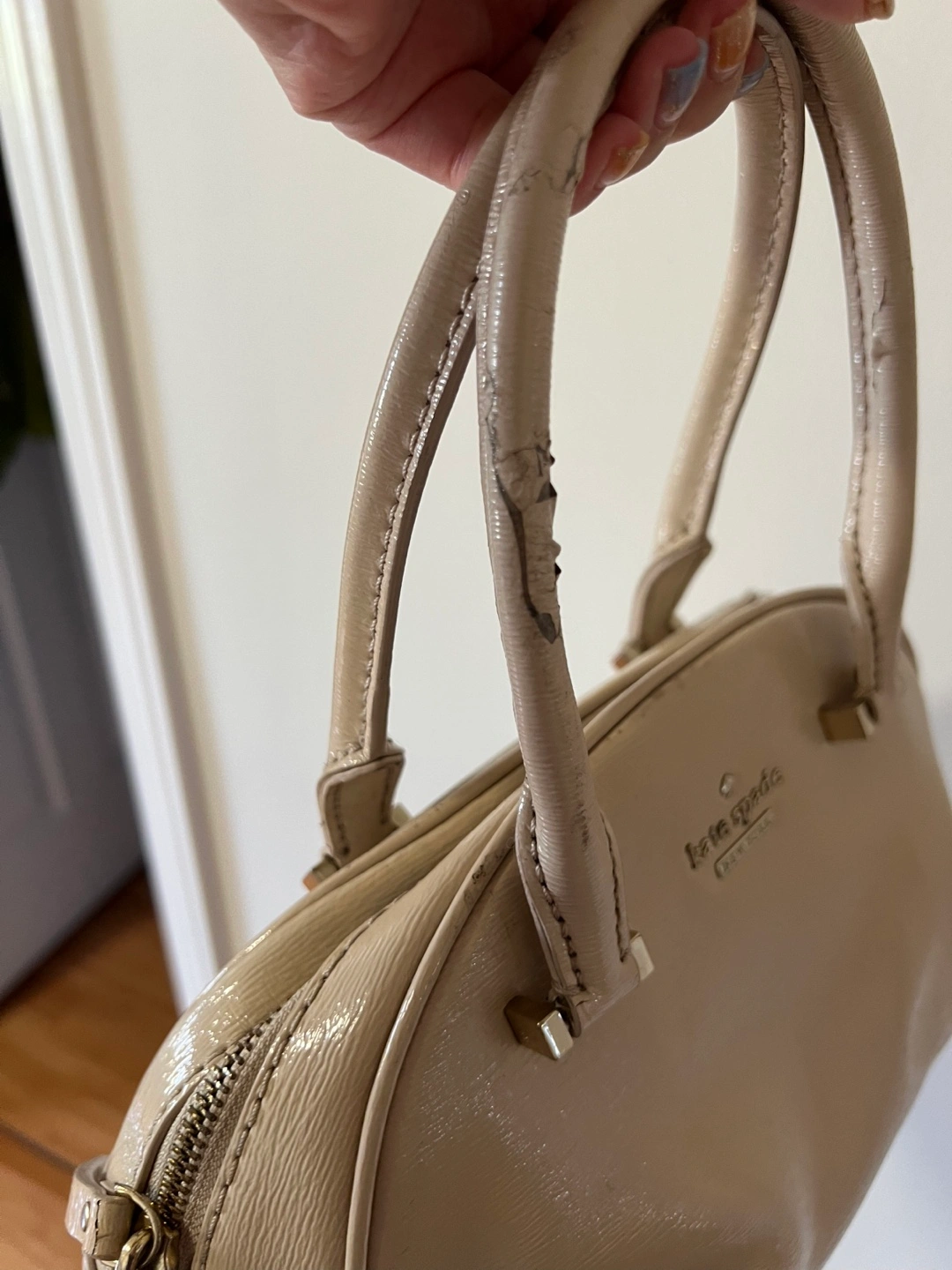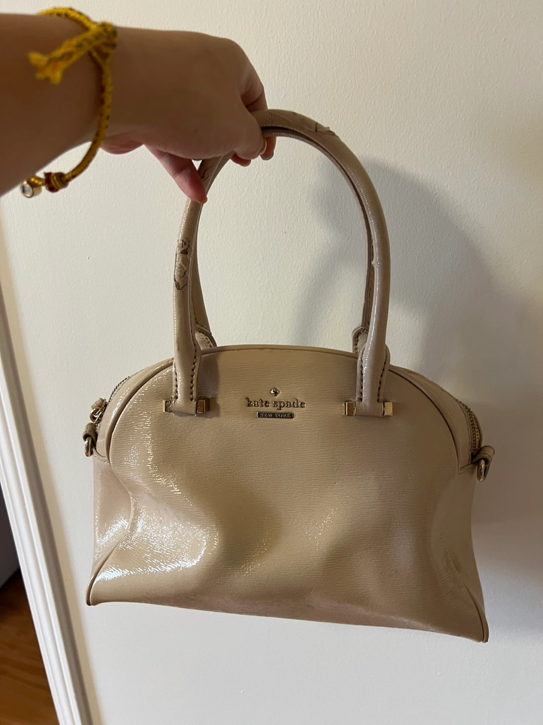 Selling a Kate Spade dome satchel in a beige colour. It has some wear and tear on the handles as shown in the pictures, but otherwise it's in good condition!