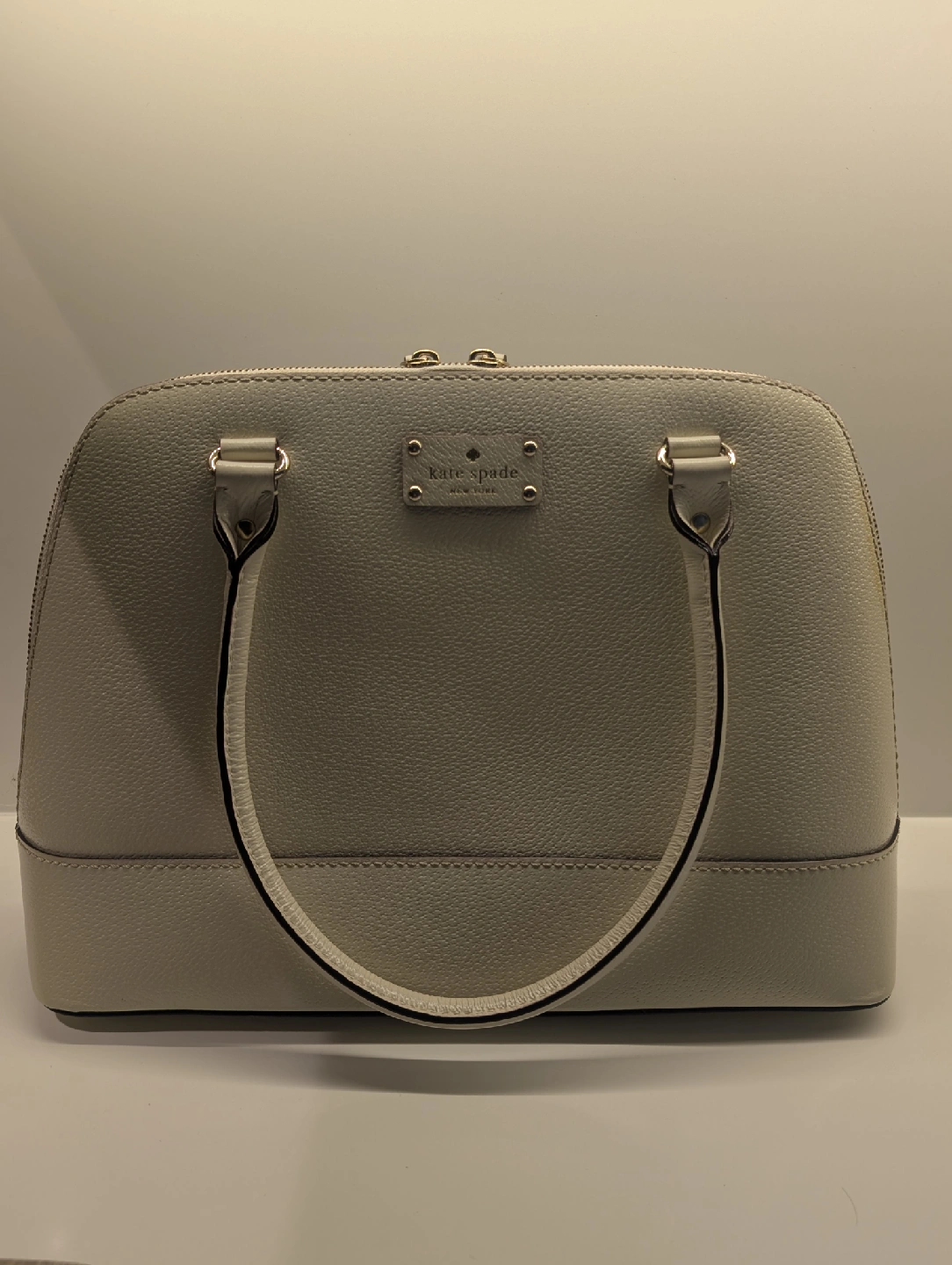 Gently used Kate Spade dome satchel in a lovely light grey colour! It's in great condition and comes with the care card. The interior has a fun pink polka dot lining. Perfect for everyday use!