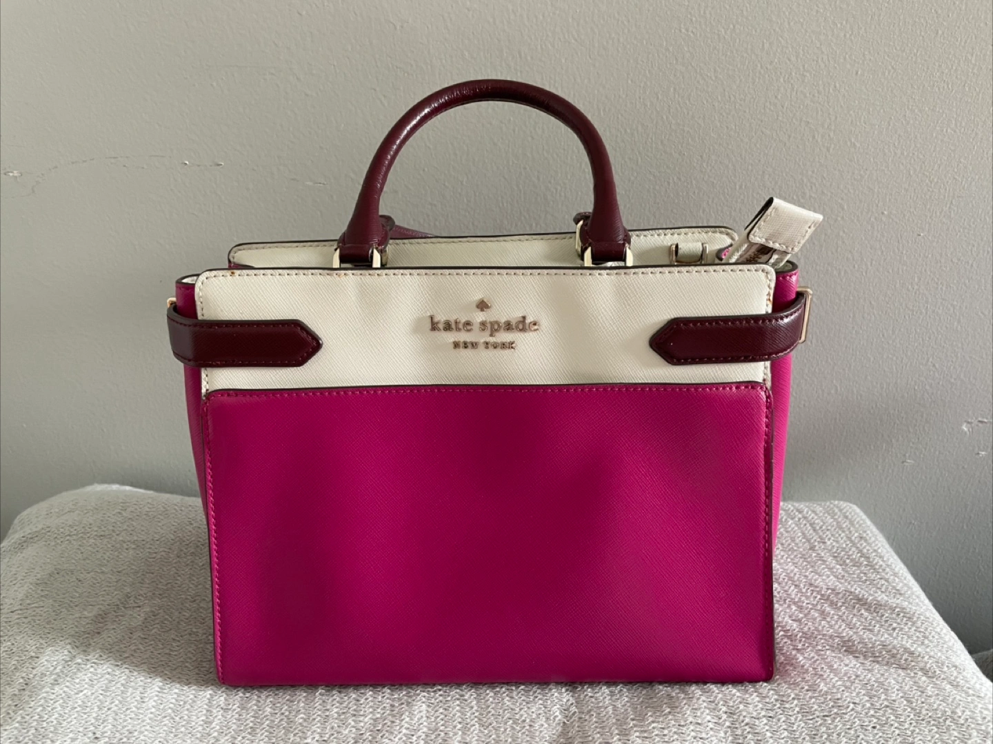 Looking to sell my Kate Spade satchel bag! It's a beautiful combination of pink and white, perfect for adding a pop of colour to any outfit. The bag is in great condition and ready for a new home!