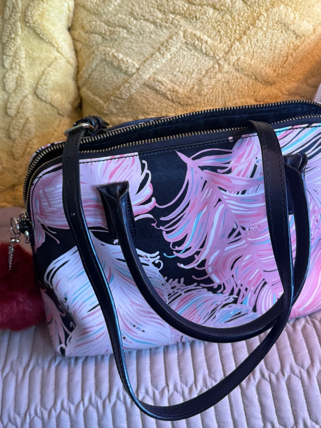 Selling a Kate Spade satchel with a matching wallet. The set features a beautiful feather design in pink, black, and white. The satchel has black handles and a zipper closure. Comes with the original Kate Spade shopping bag too! There’s a little sign of wear inside but not visible as shown in the picture but definitely almost perfect.well maintained and kept it in clean environment. good to go