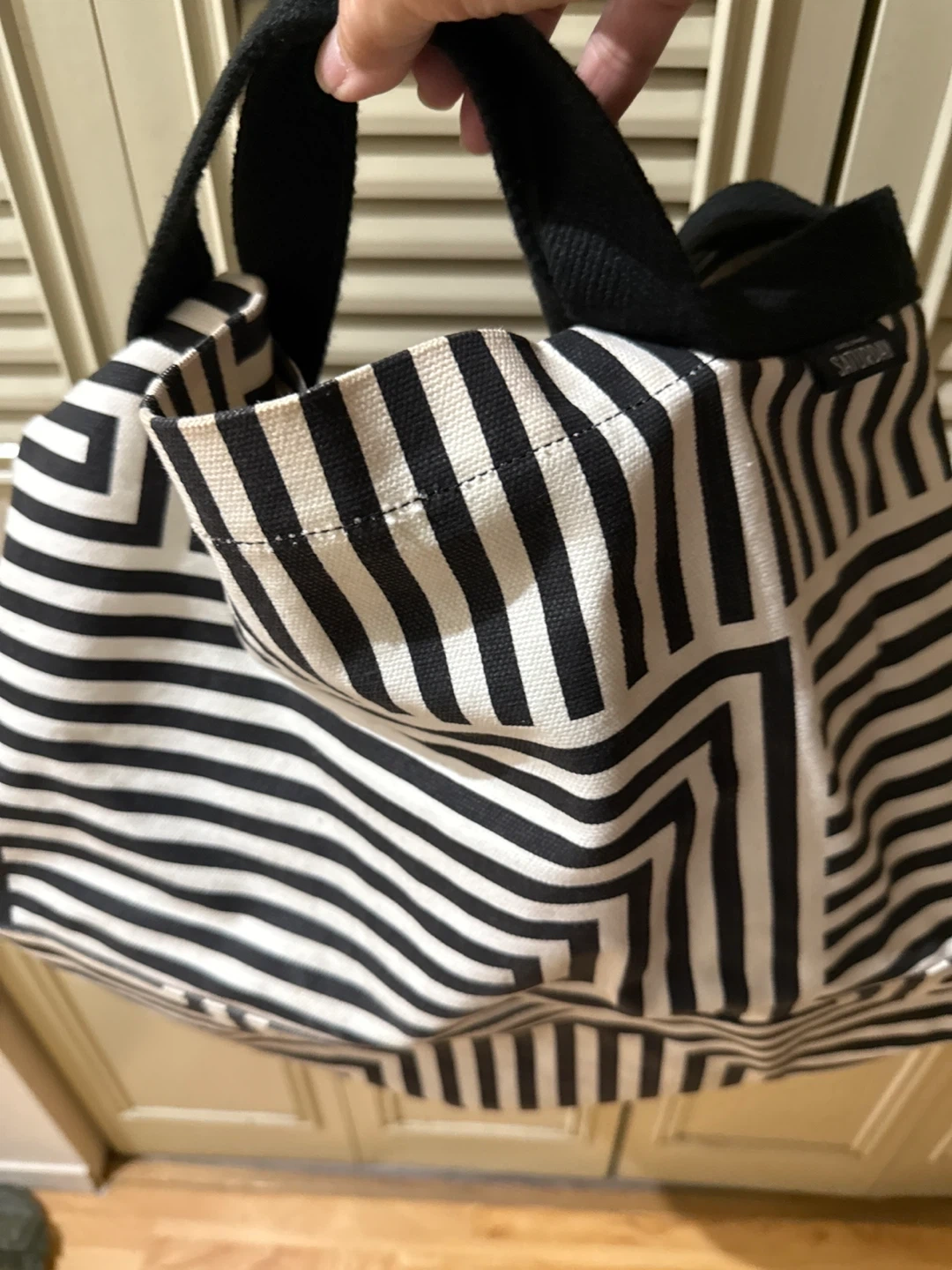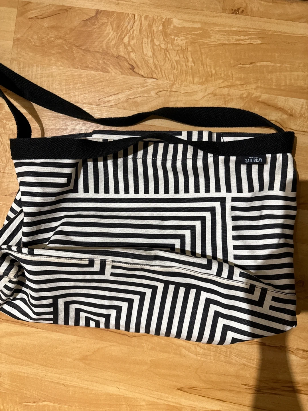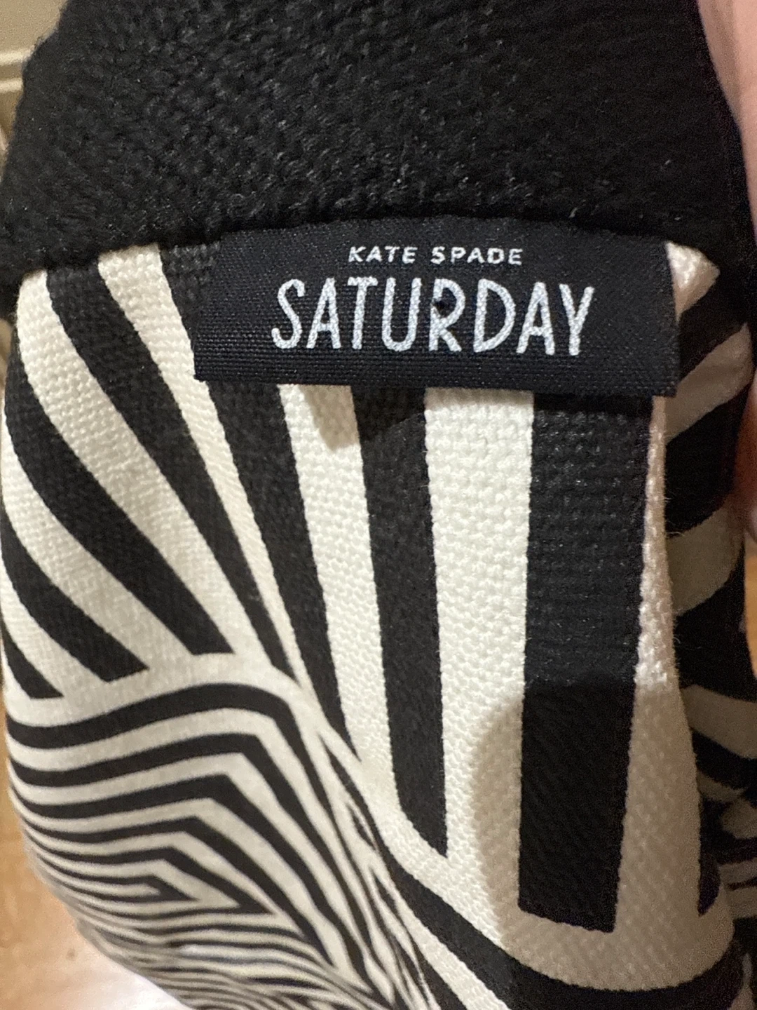 Looking to sell this Kate Spade Saturday tote bag! It's in great shape and features a stylish black and white geometric pattern. Perfect for carrying your everyday essentials. The bag has a black shoulder strap and a convenient outer pocket. Great for adding a bit of style to your daily errands!