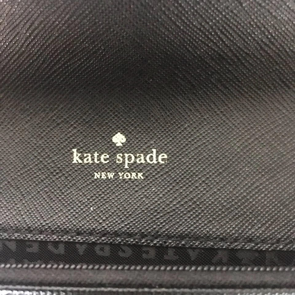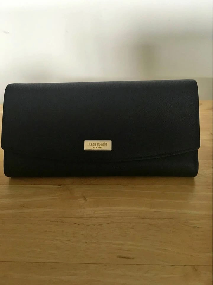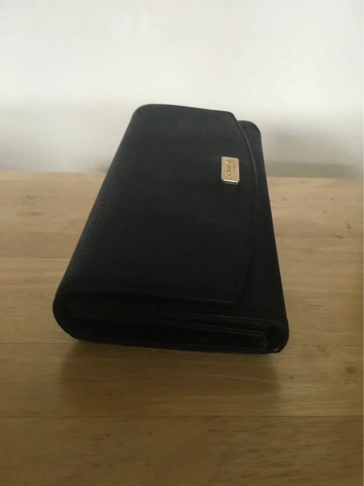 Sleek black leather wallet. Closed: 7 3/4” L x 4” W x 1” D. Open: 11 3/4”L. Inside zip pocket. 14 credit or business card slots. 2 large openings on inside for bills, receipts etc. 1 large back pocket. No cracks, zipper and closure work well. Smoke free home