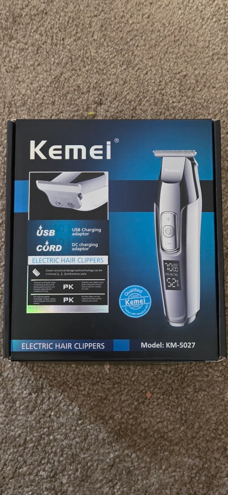 Selling a brand new Kemei KM-5027 electric hair clipper, still in its original packaging! This clipper features: - USB charging cord - DC charging adaptor - Imported titanium steel manual knife mold - Ultra thin heads with push-type switch, easy to operate - Accessories included: power adapter, cleaning brush, and various haircut limit combs Get professional-quality cuts at home!